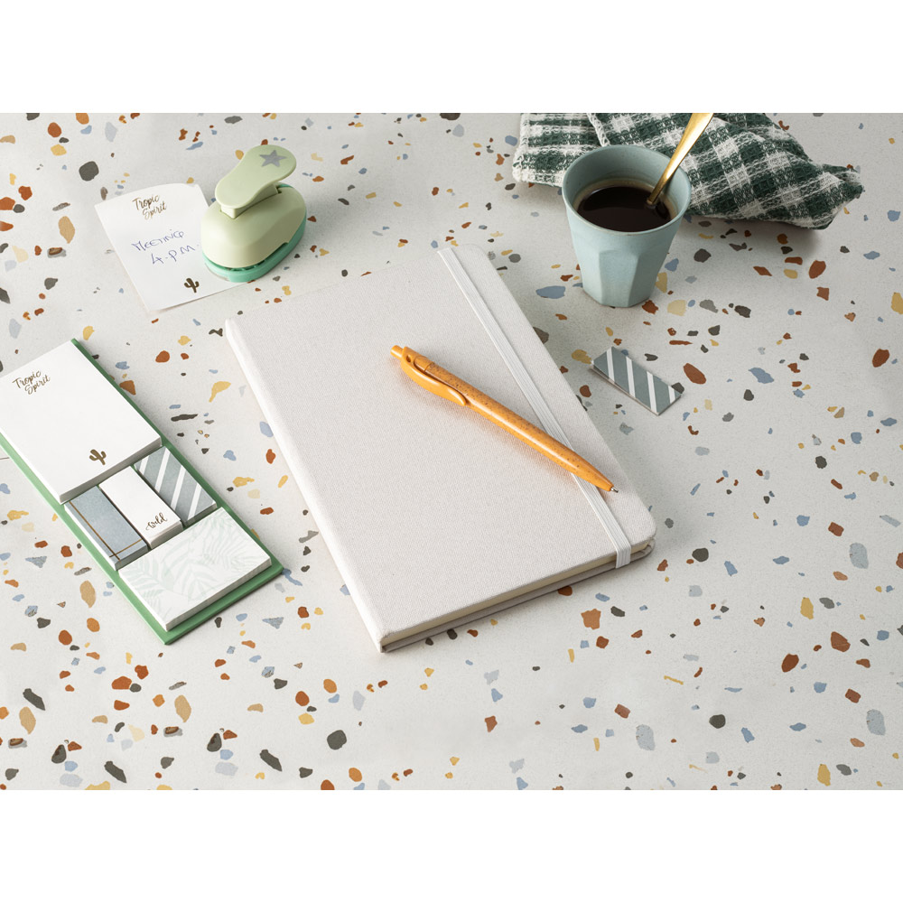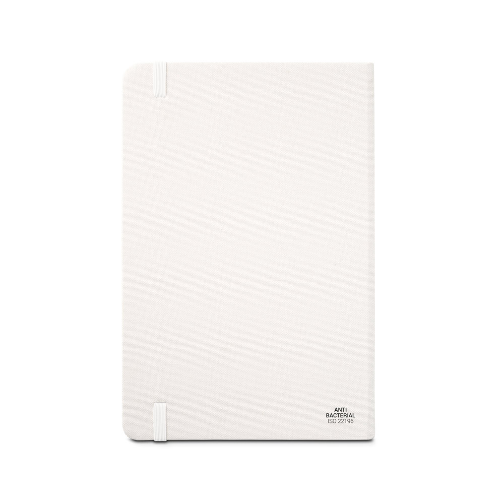 Caderno A5 de capa dura em poliéster 100% reciclado (100% rPET)com tratamento antibacteriano, segundo a certificação ISO 22196. Contém 160 páginas pautadas cor marfim, em papel proveniente de gestão florestal sustentável, elástico e fita separadora. 140 x 210 mm