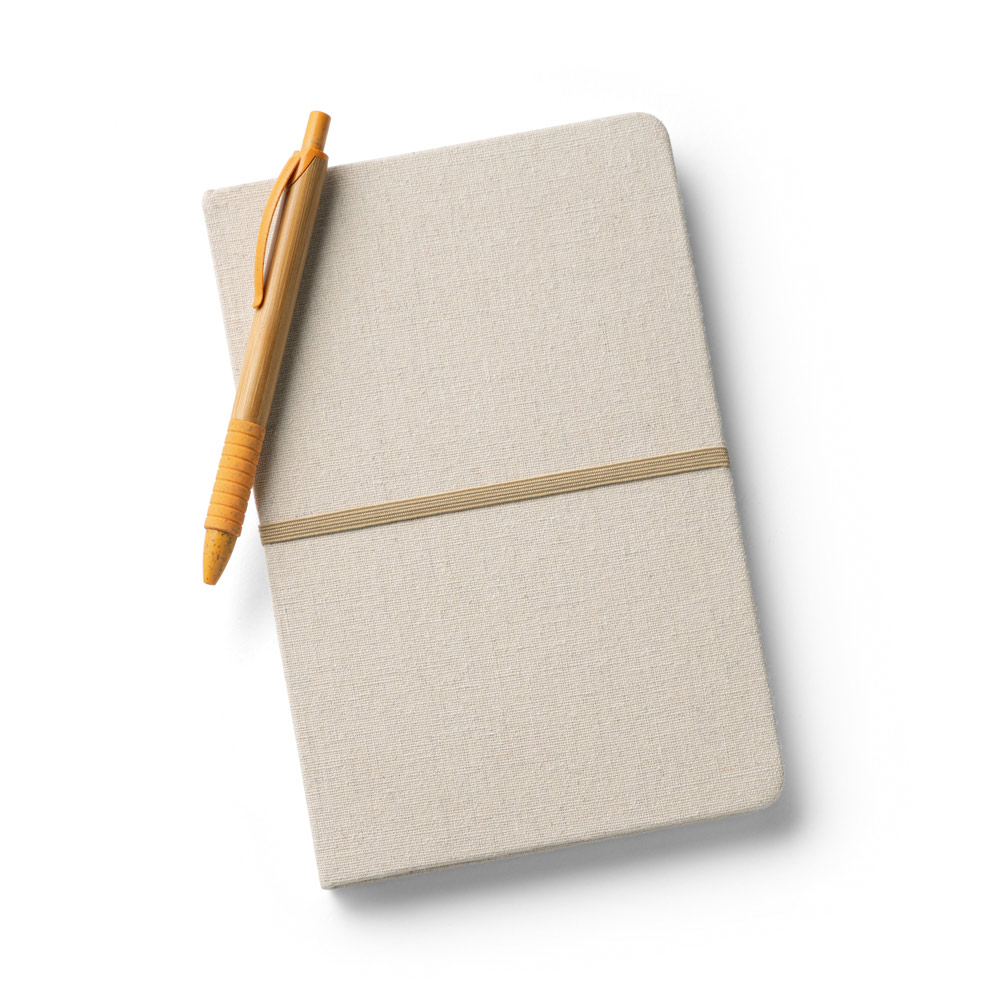 Caderno A5 de capa dura em linho (230 g/m²), com cantos redondos. Contém 192 páginas pautadas e elástico na horizontal para fecho do caderno. 140 x 210 mm