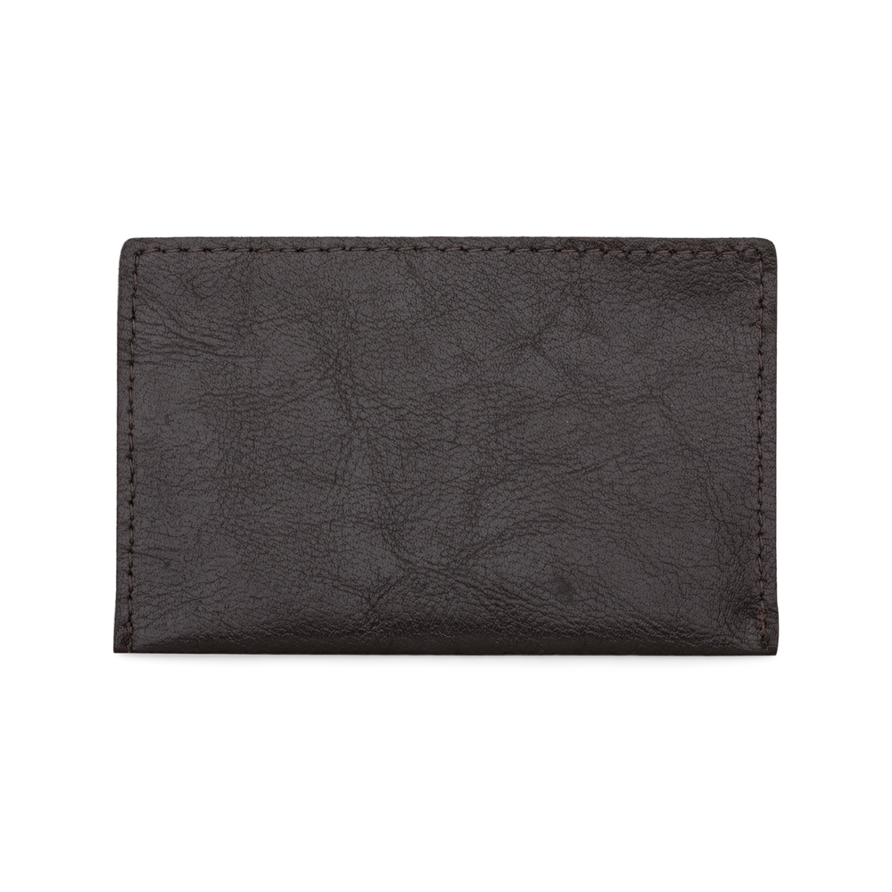 Porta cartão em couro sintético com duas divisórias frontais, verso liso.