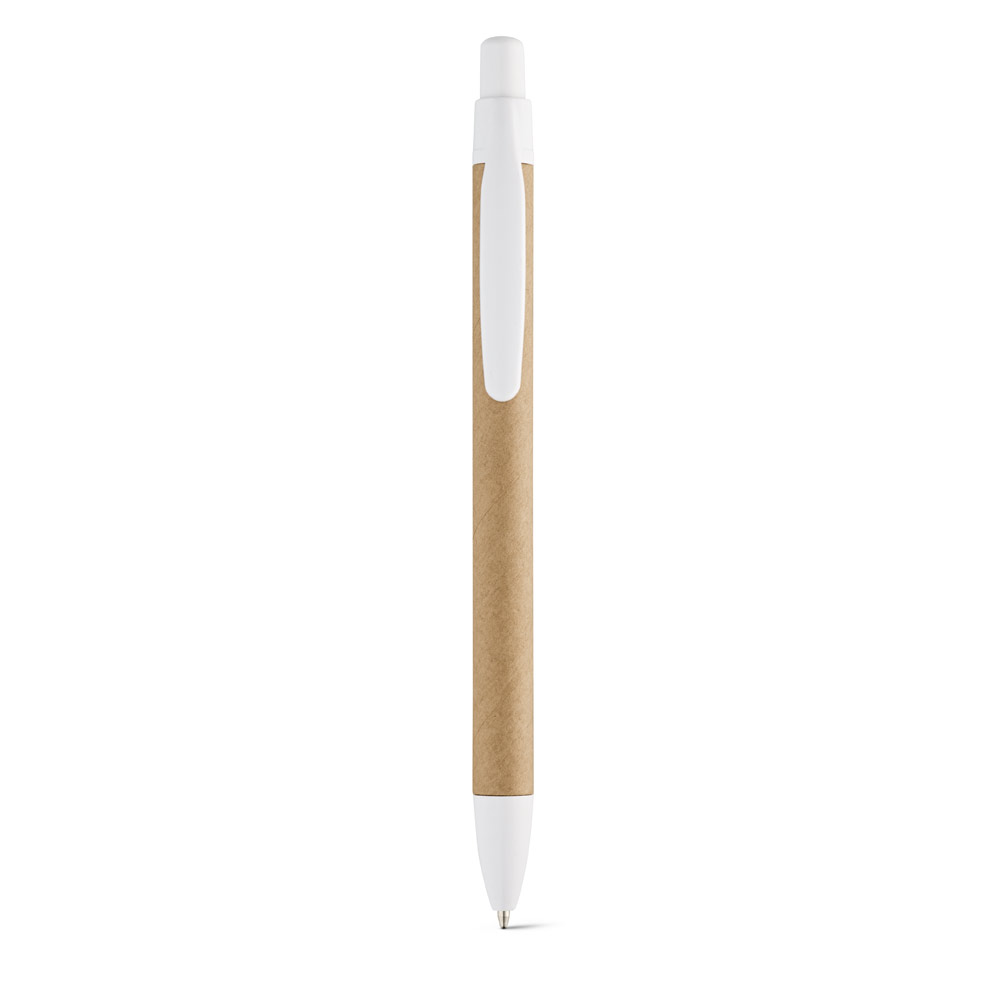 Pasta A4 em cartão kraft 100% reciclado (450 g/m²) com um bloco de 40 páginas lisas 100% recicladas e suporte para cartão de visita. Incluso esferográfica com escrita em azul. 230 x 320 x 15 mm