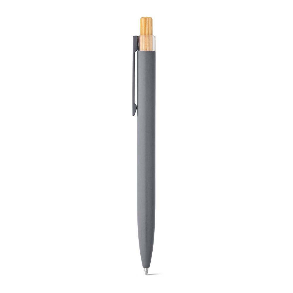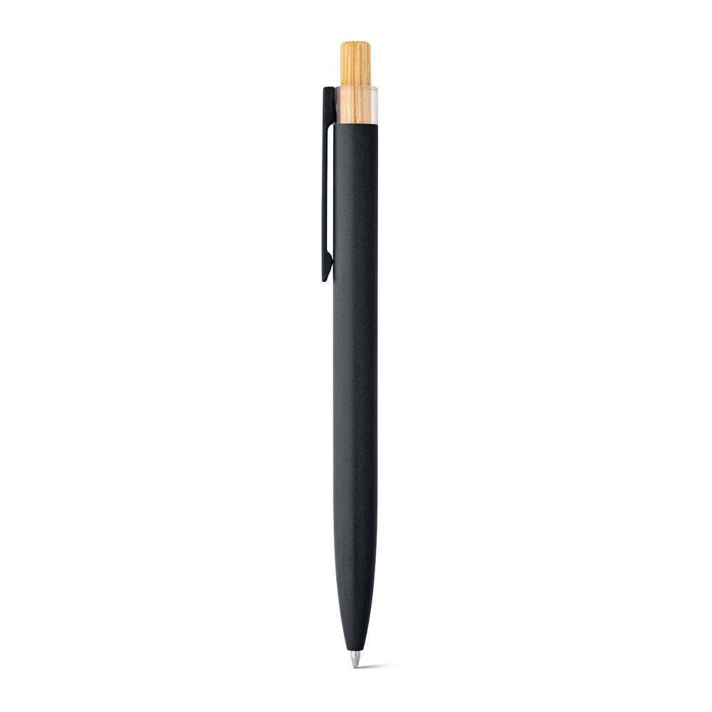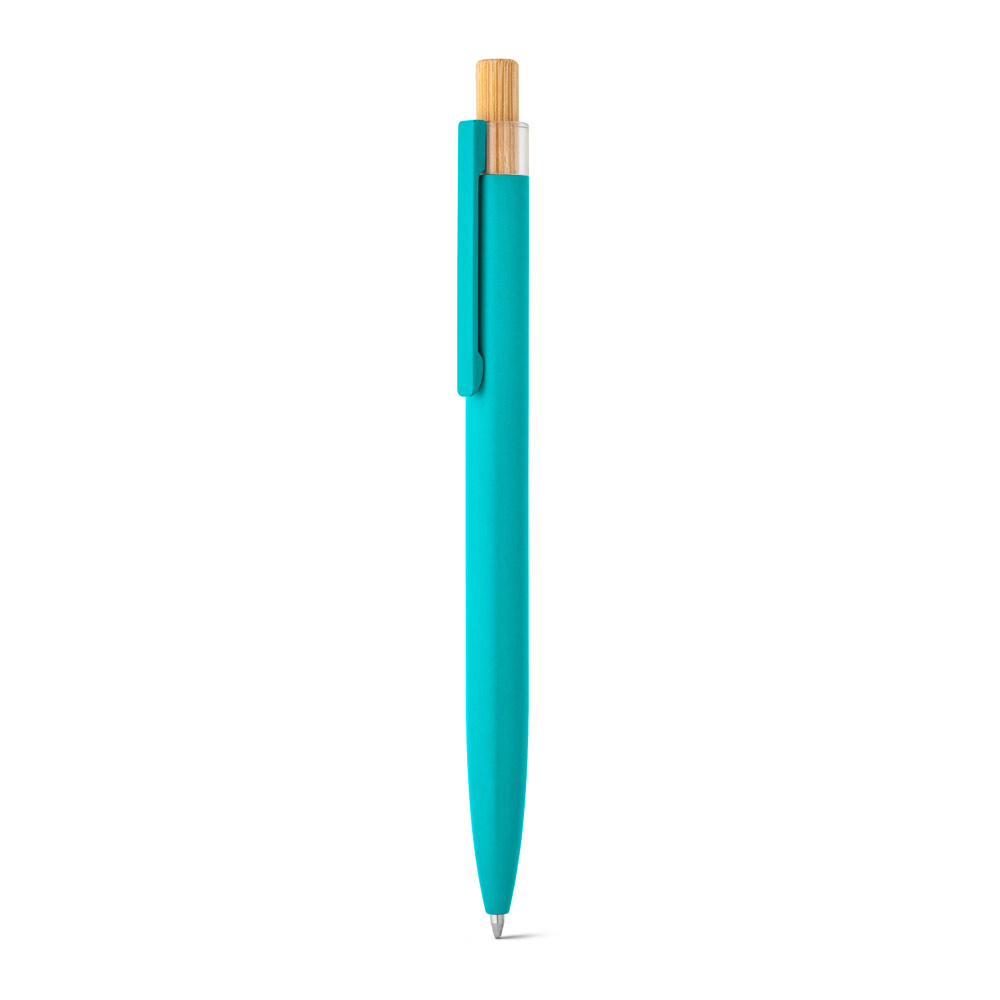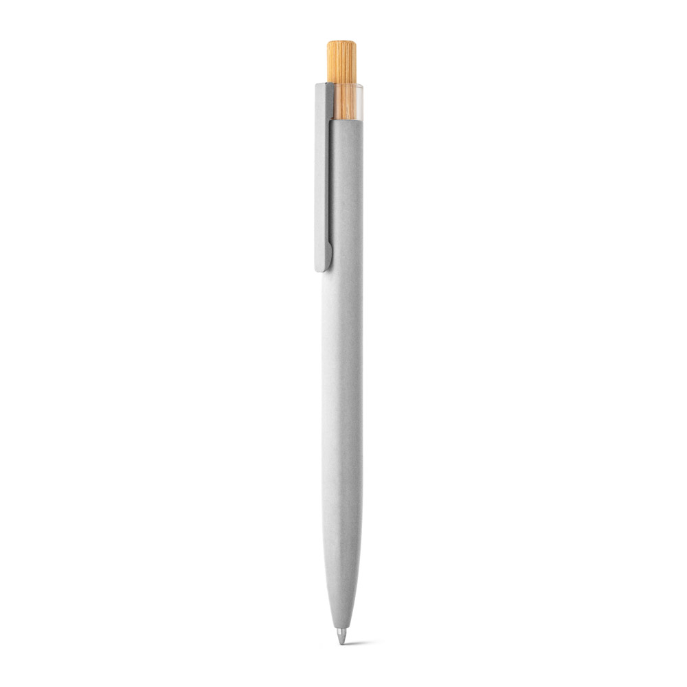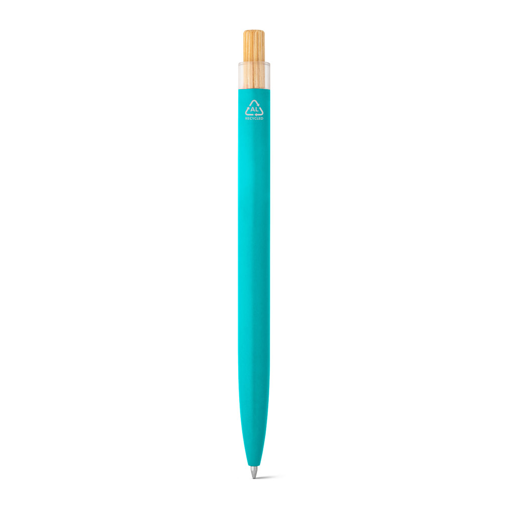 Esferográfica com corpo em alumínio 100% reciclado, topo em Pet 100% reciclado, botão em bambu e clipe de metal. Escrita em azul até 1.5 km. A cor e o resultado da impressão nos materiais naturais pode variar entre produtos. ø10 x 140 mm