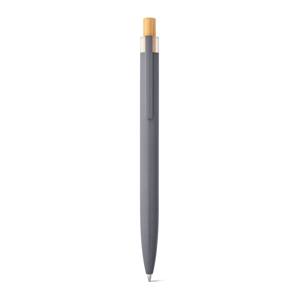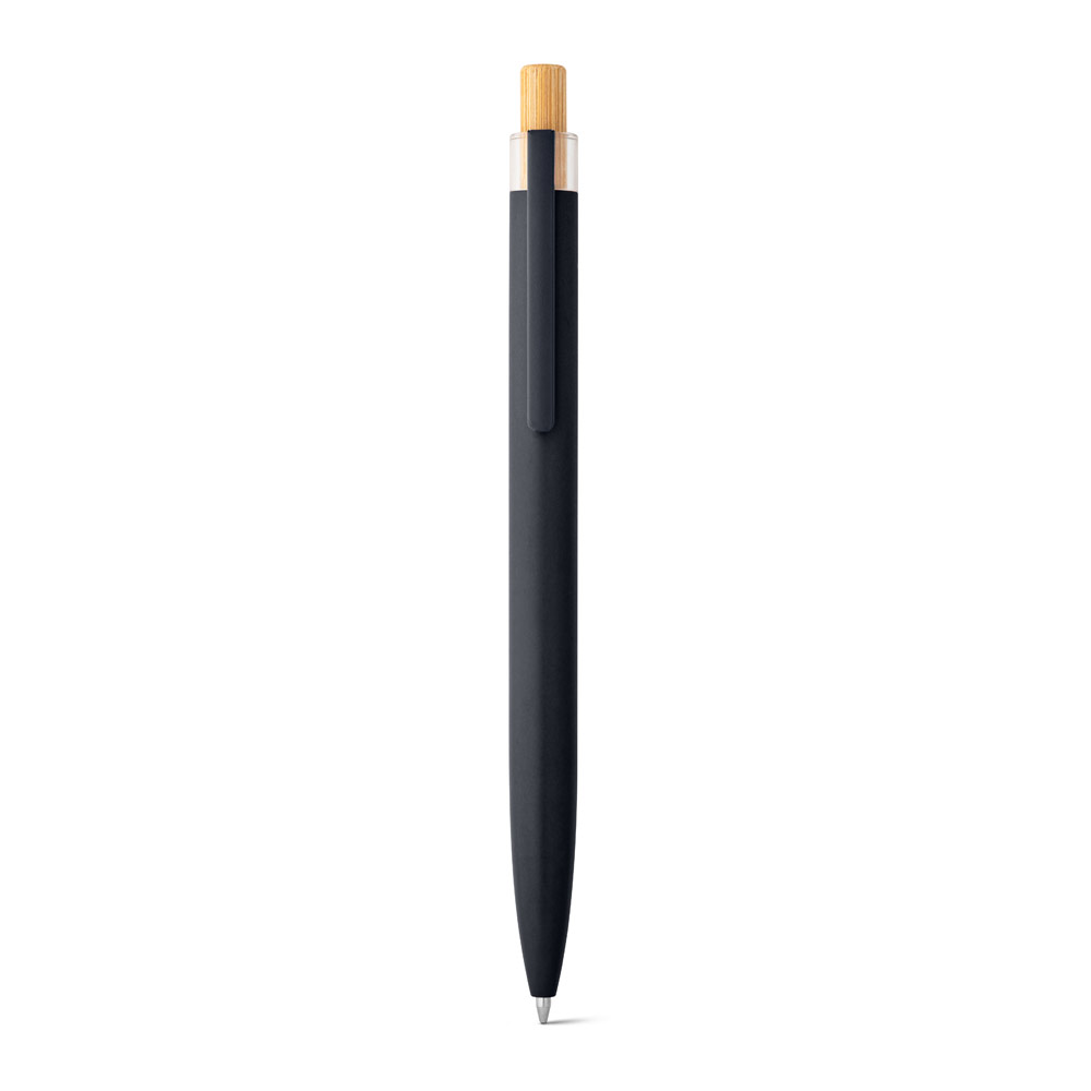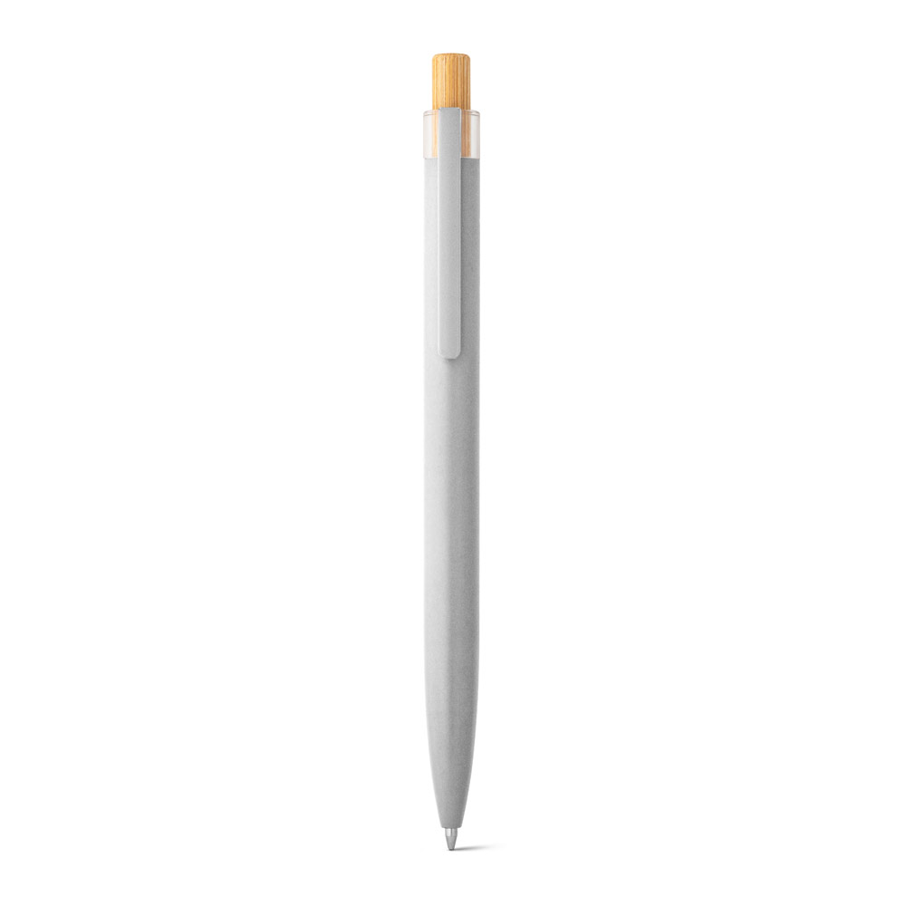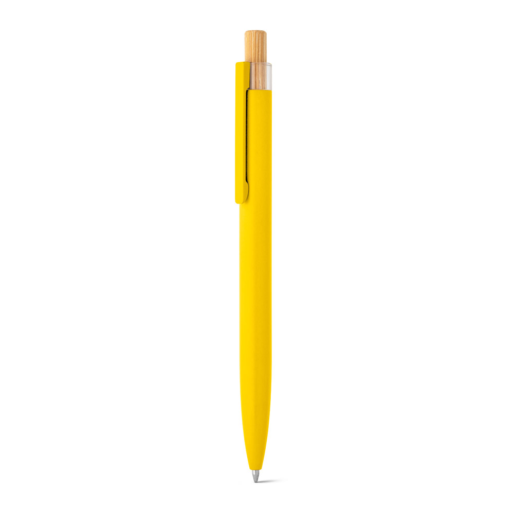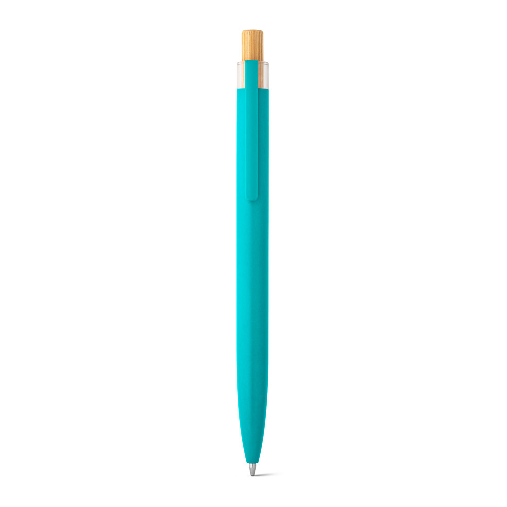 Esferográfica com corpo em alumínio 100% reciclado, topo em Pet 100% reciclado, botão em bambu e clipe de metal. Escrita em azul até 1.5 km. A cor e o resultado da impressão nos materiais naturais pode variar entre produtos. ø10 x 140 mm