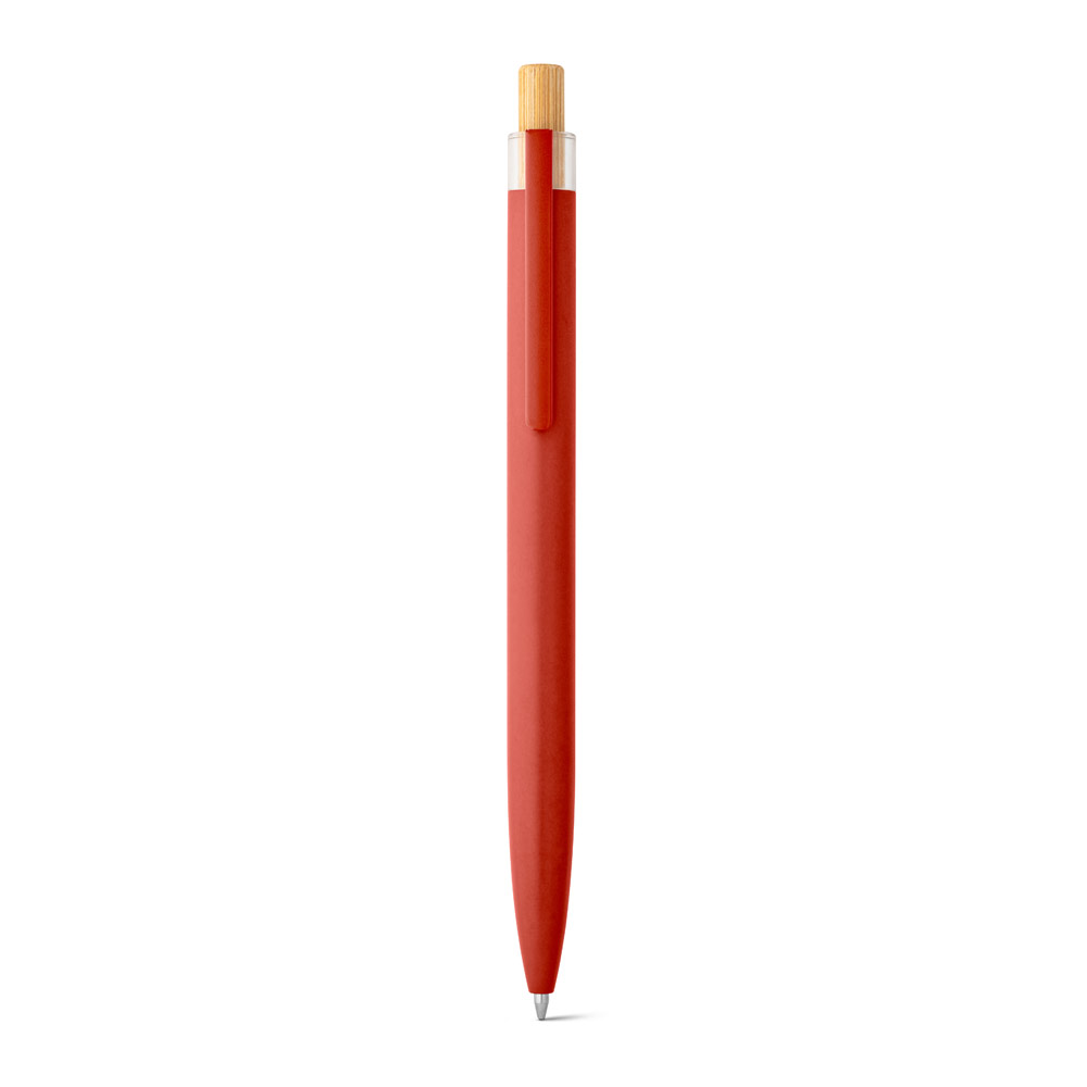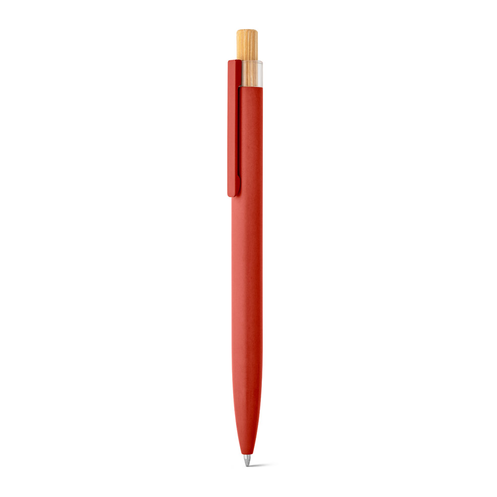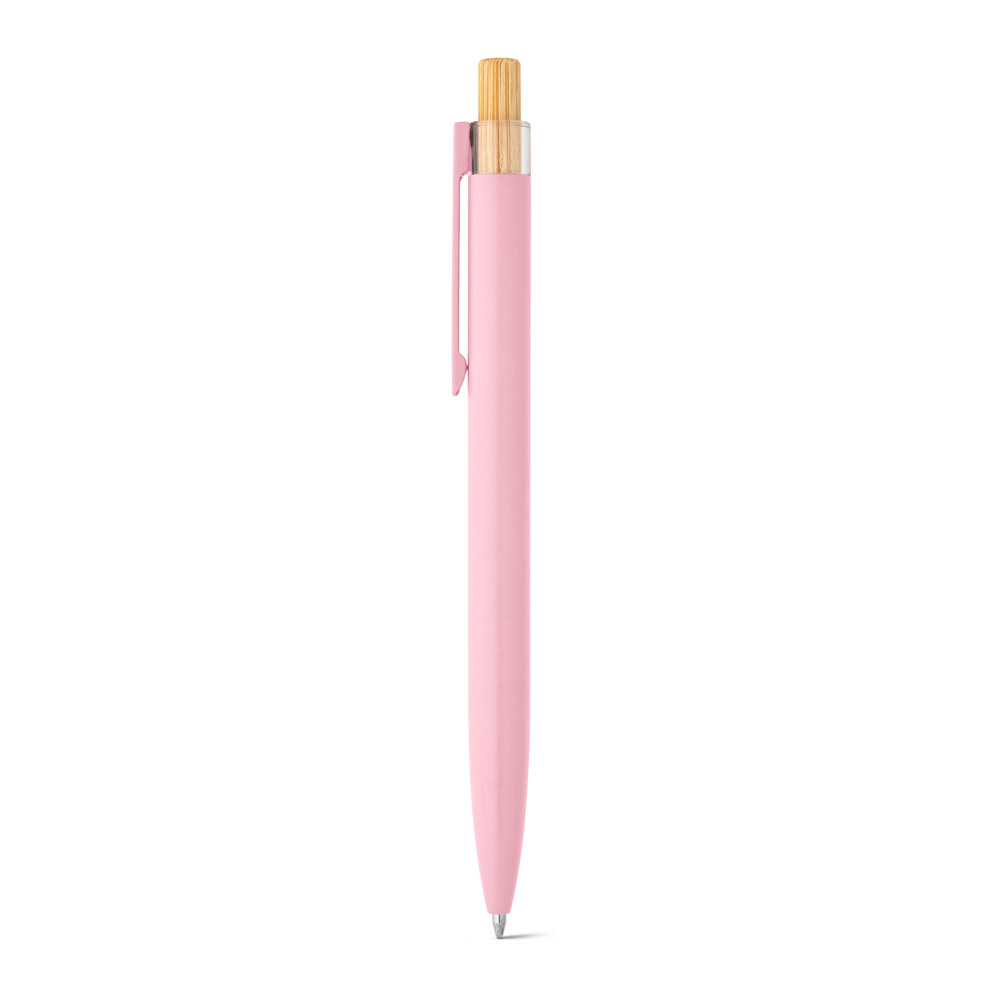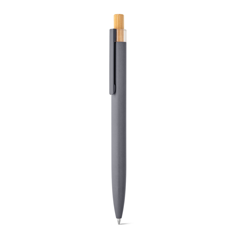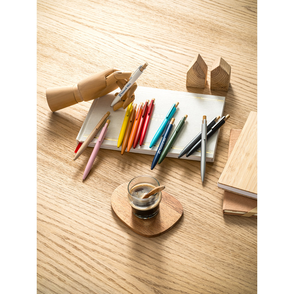 Esferográfica com corpo em alumínio 100% reciclado, topo em Pet 100% reciclado, botão em bambu e clipe de metal. Escrita em azul até 1.5 km. A cor e o resultado da impressão nos materiais naturais pode variar entre produtos. ø10 x 140 mm