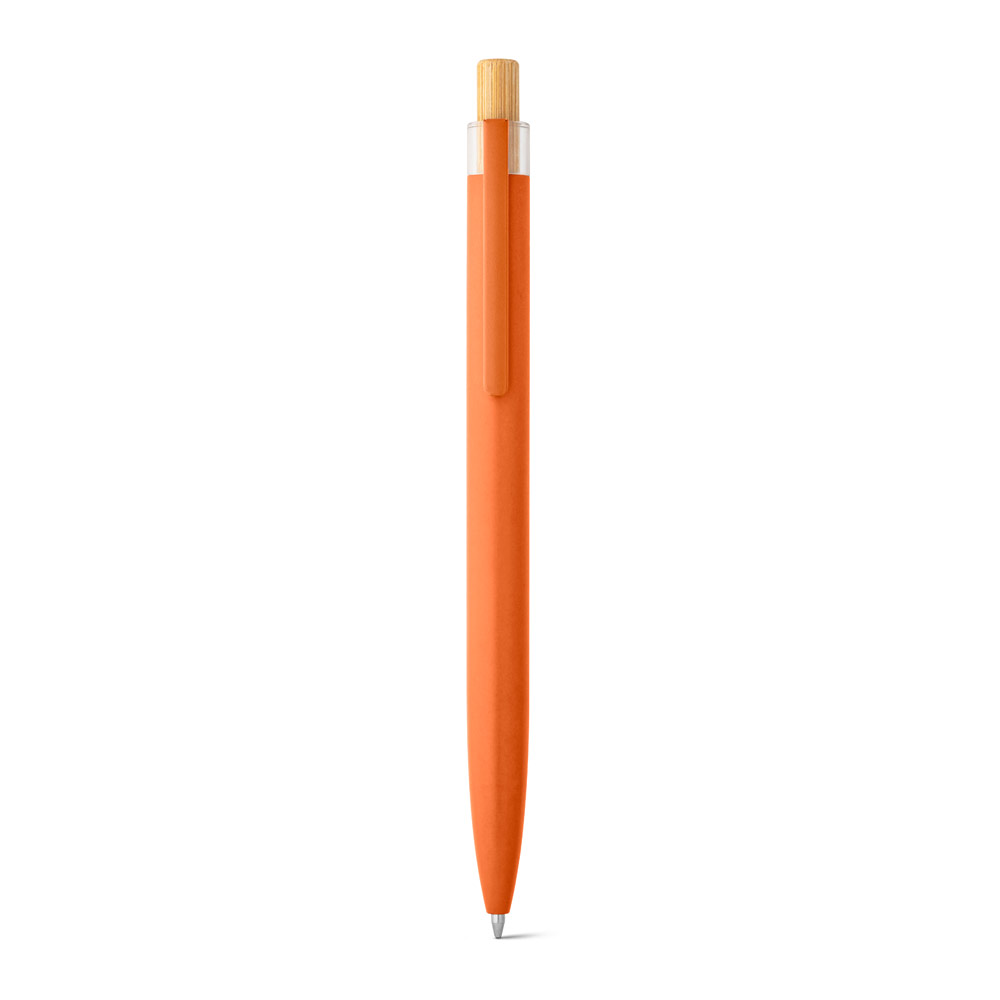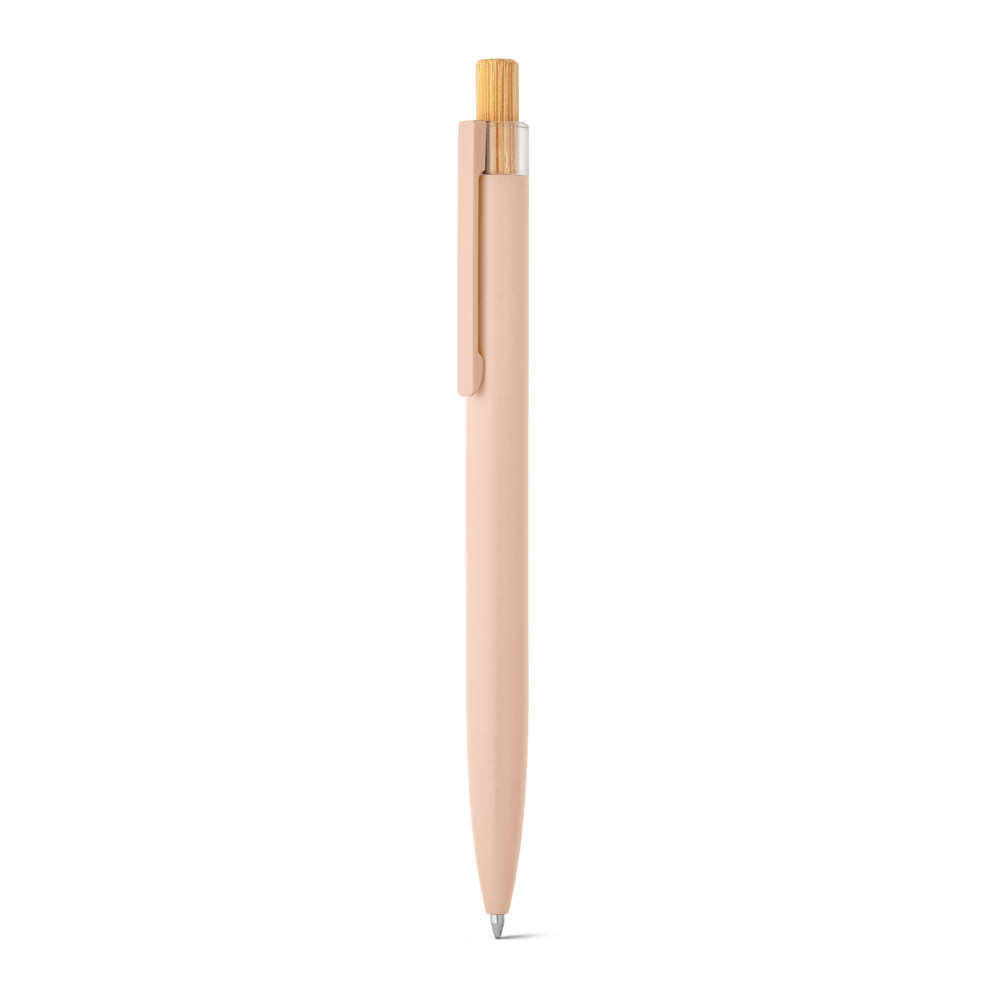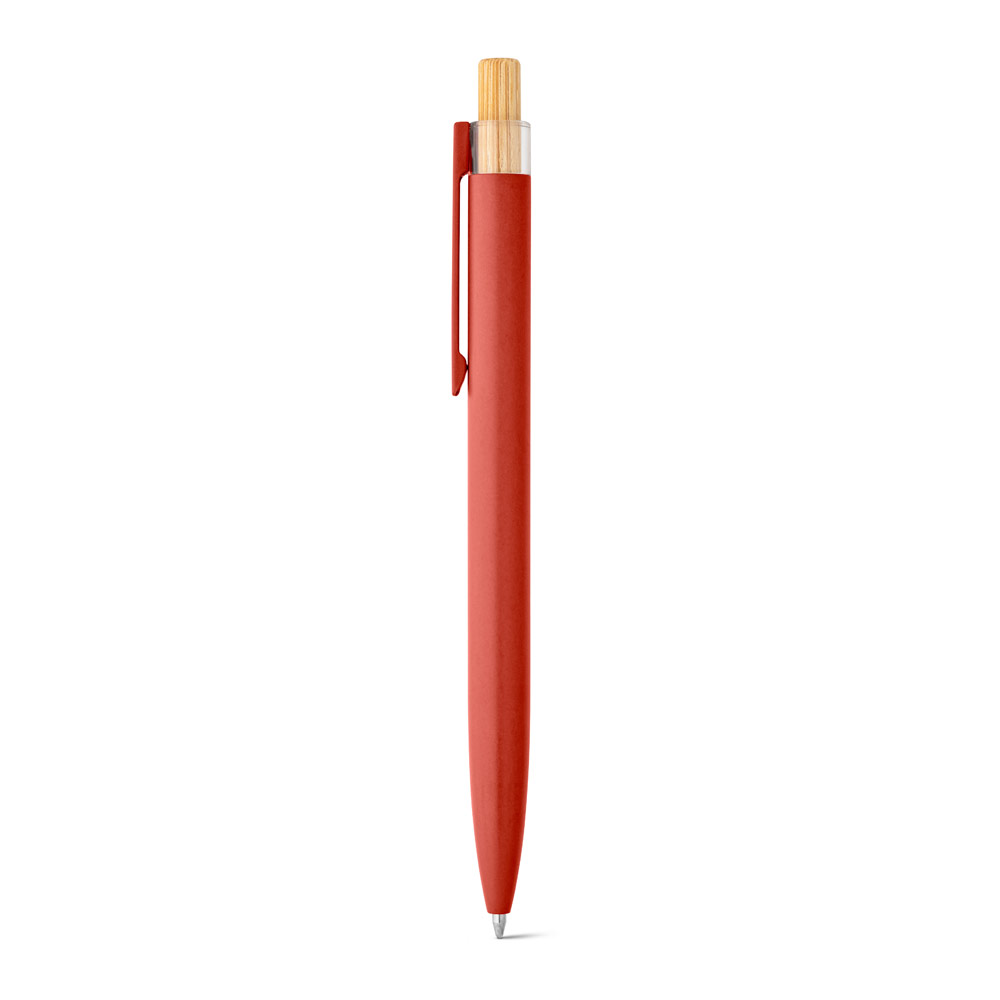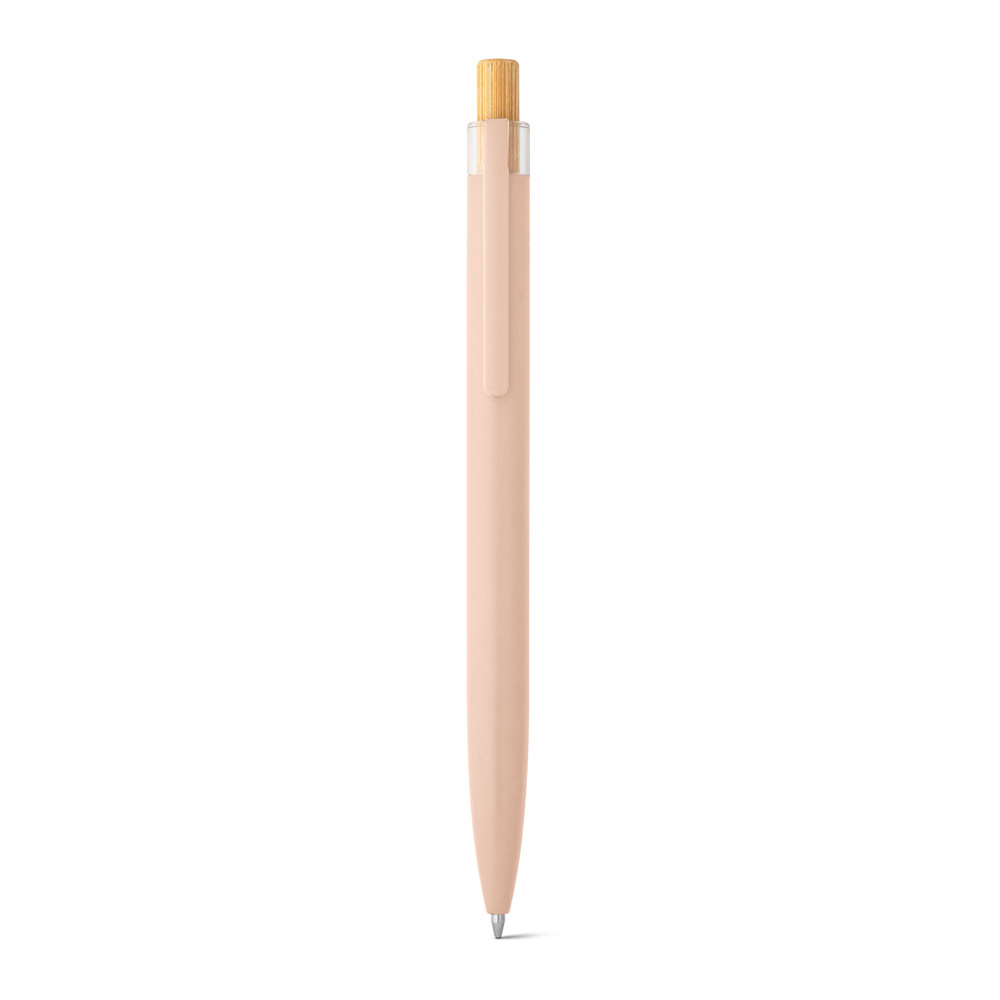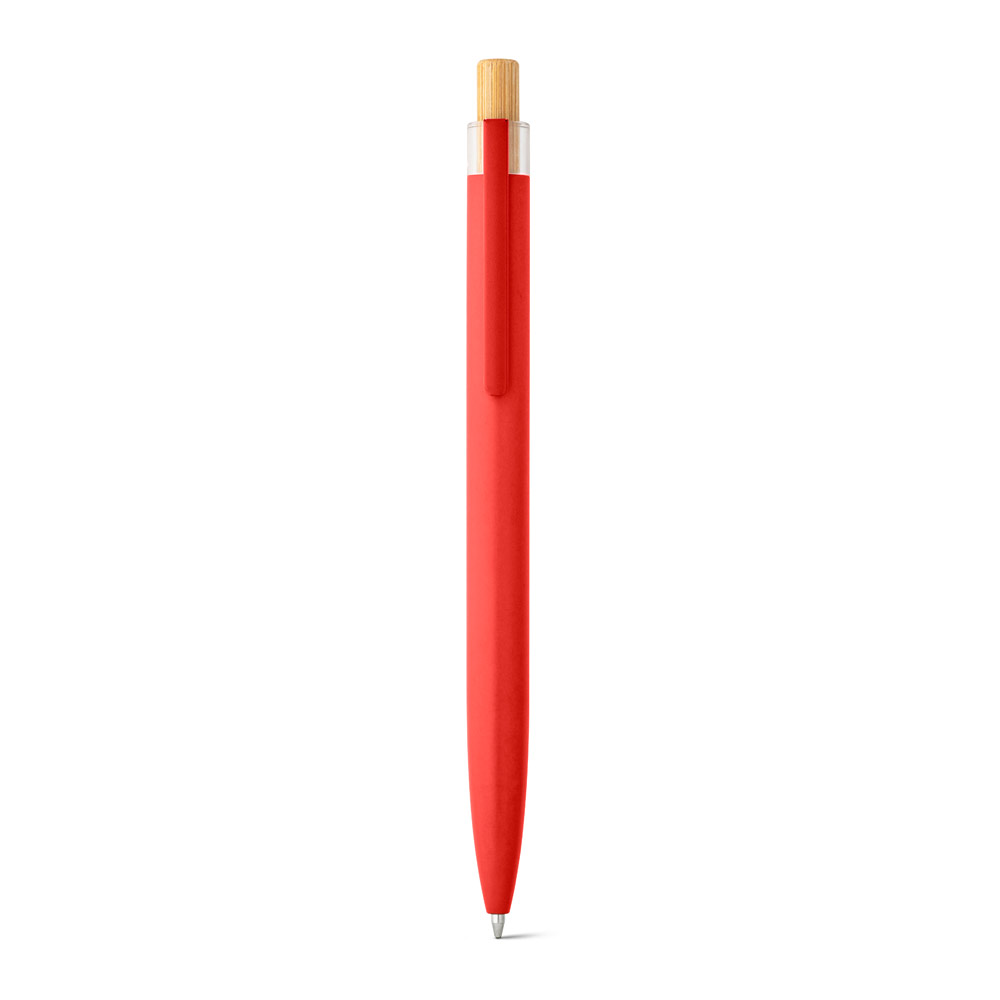 Esferográfica com corpo em alumínio 100% reciclado, topo em Pet 100% reciclado, botão em bambu e clipe de metal. Escrita em azul até 1.5 km. A cor e o resultado da impressão nos materiais naturais pode variar entre produtos. ø10 x 140 mm