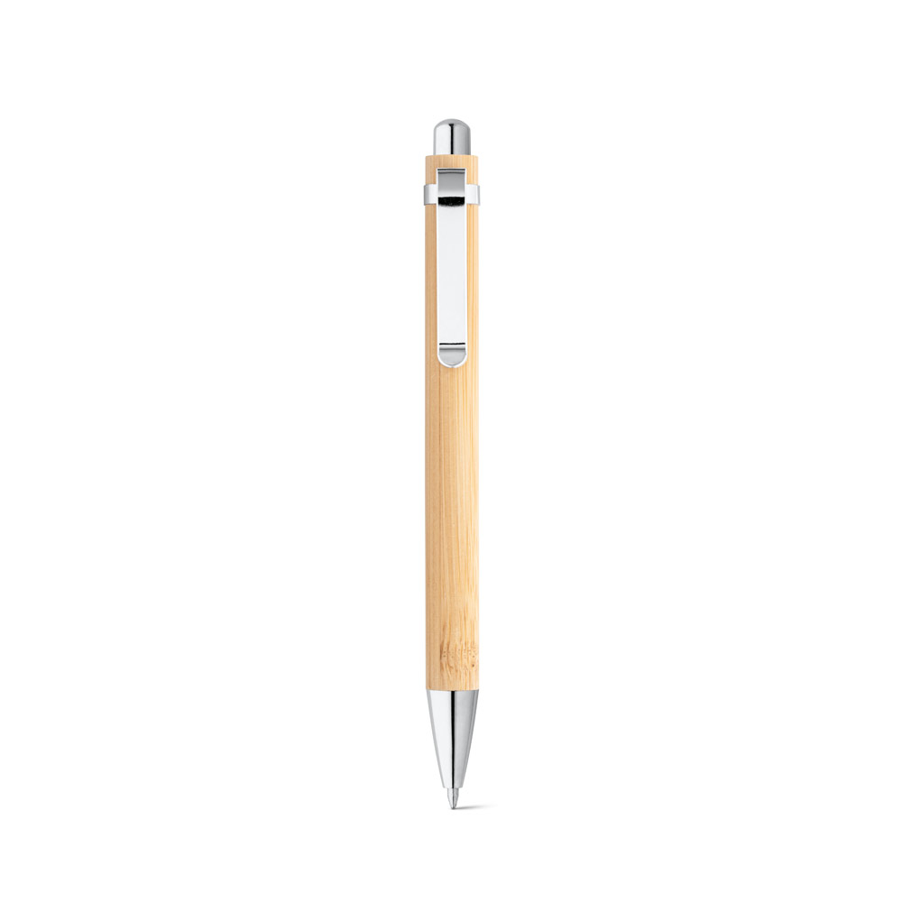 Esferográfica em bambu com clipe de metal. Escrita em azul até 1.5 km. A cor e o resultado da impressão nos materiais naturais pode variar entre produtos. ø11 x 138 mm