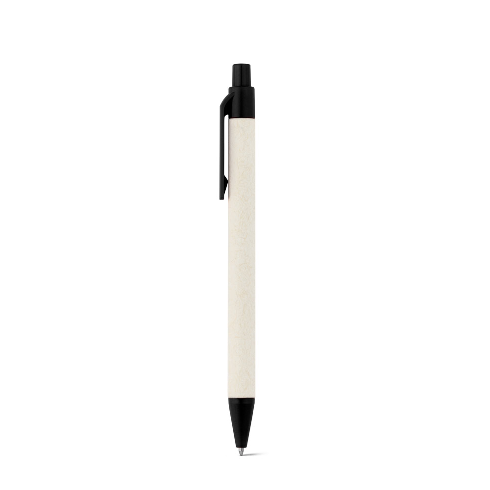 Esferográfica produzida através de pacotes de leite reciclados, contribuindo para o reaproveitamento do cartão e alumínio. Corpo em cartão e componentes coloridos em ABS 100% reciclado. Escrita em azul até 1.5 km. ø10 x 139 mm