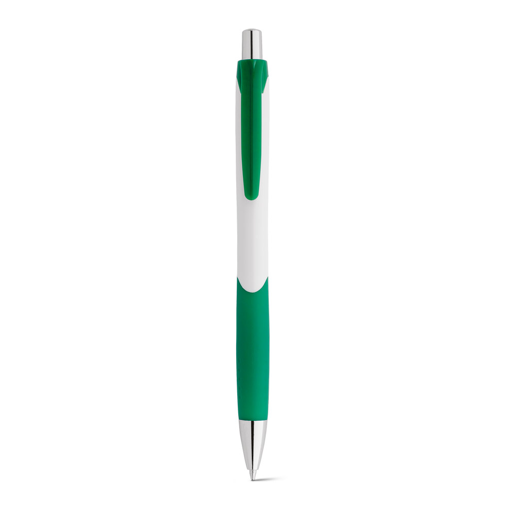 Esferográfica em ABS com grip, acabamento brilhante e ponteira cromada. Escrita em azul até 1.5 km. Produto certificado de acordo com a portaria Inmetro nº423 de 8/out/2021. ø11 x 140 mm