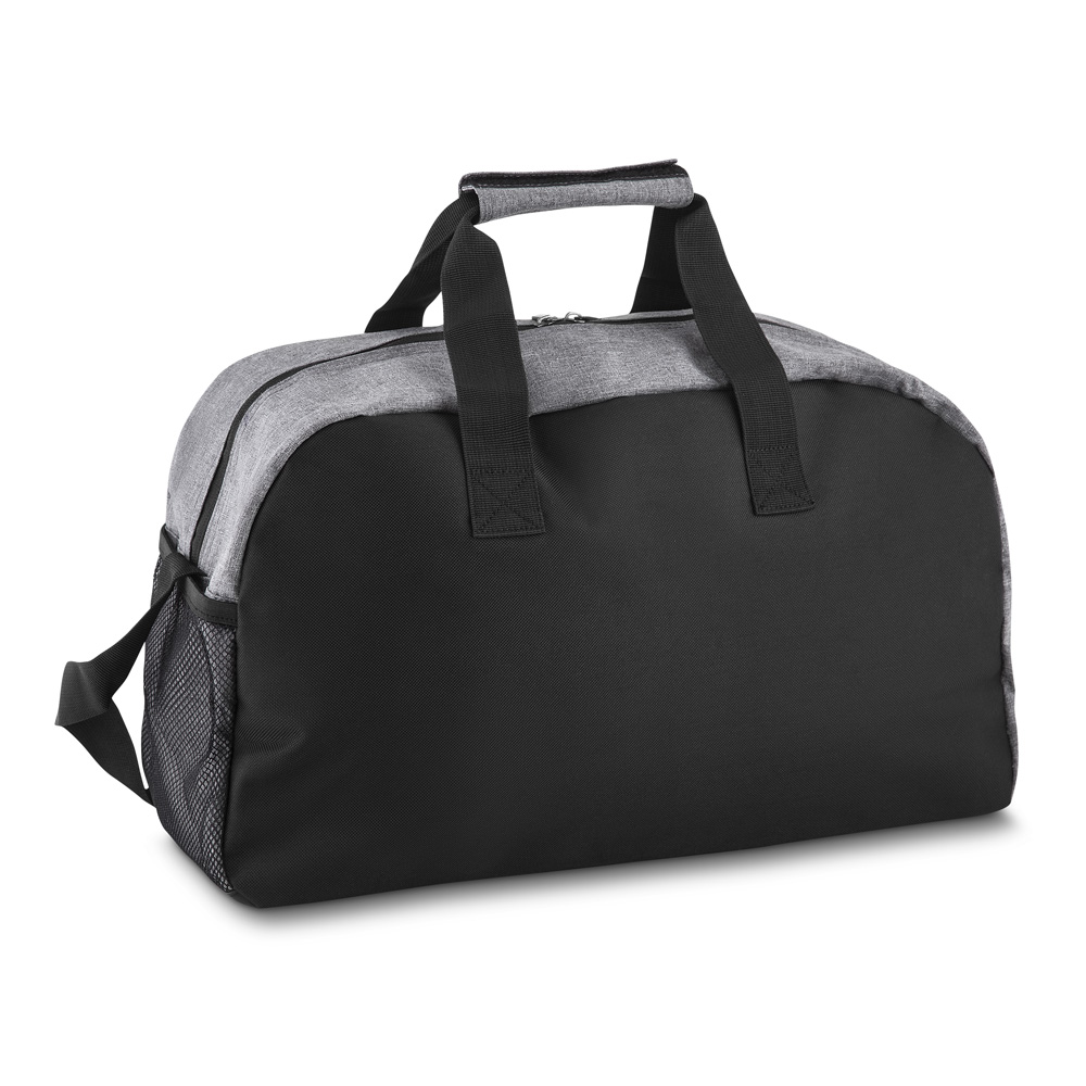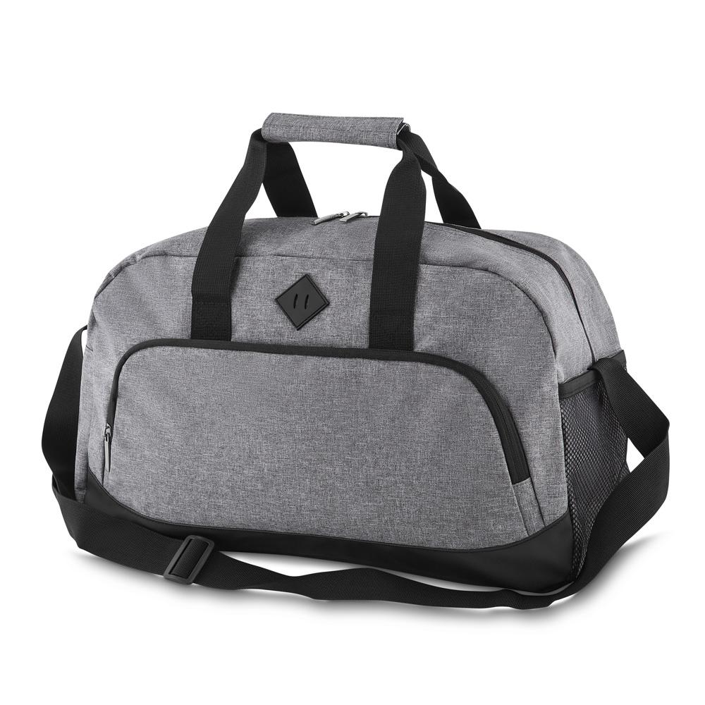 Mala esportiva em poliéster 300D mescla com alça de mão e ombro. Bolso frontal e lateral.
