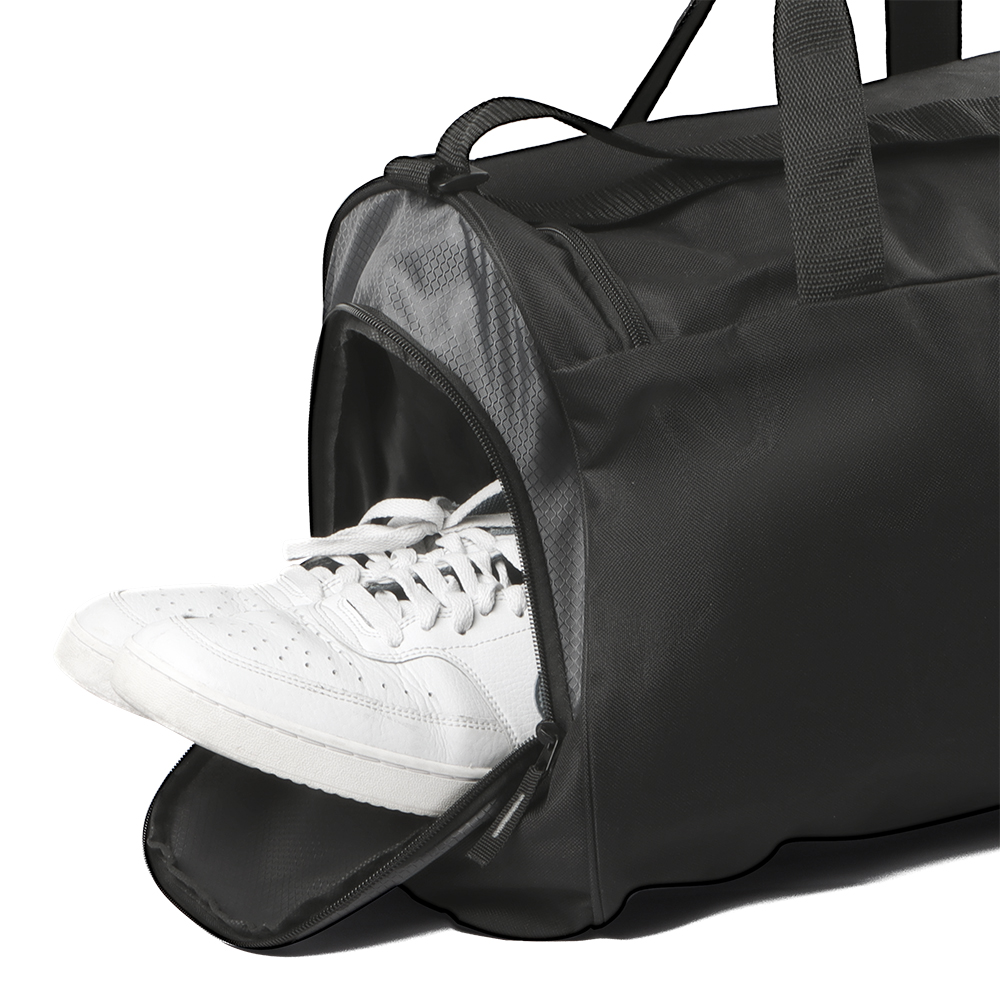 Mala esportiva em tecido poliéster 600D e 210D na parte inferior, compartimento interno para roupas e compartimento externo para roupa suja. Na parte inferior da mala possui 4 borrachas de apoio para que a mala não encoste diretamente no chão. Zíper frontal e bolsos laterais, com alça de mão e ombro.