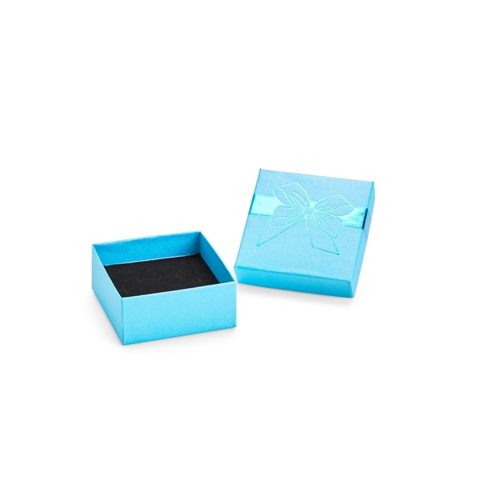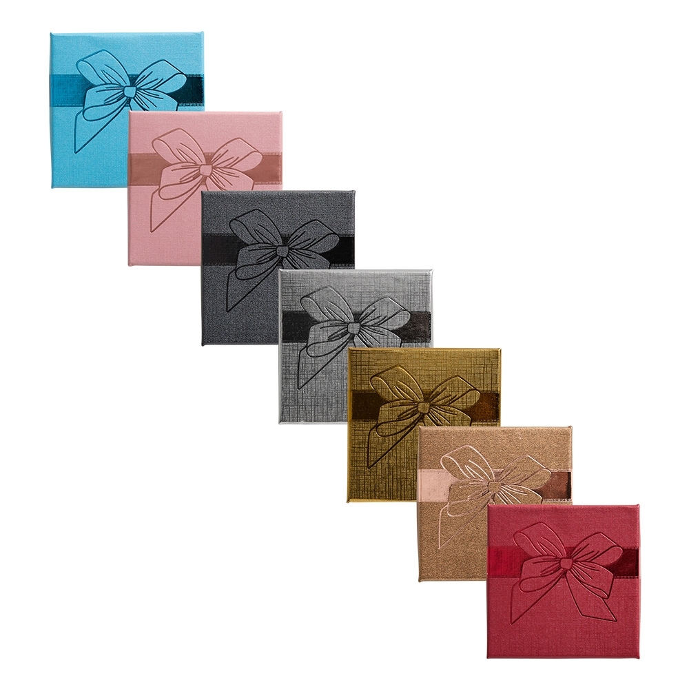 Caixa para presente compacta em papelão com acabamento levemente texturizado e ilustração de laço na tampa. Acompanha berço removível em espuma com ranhuras.