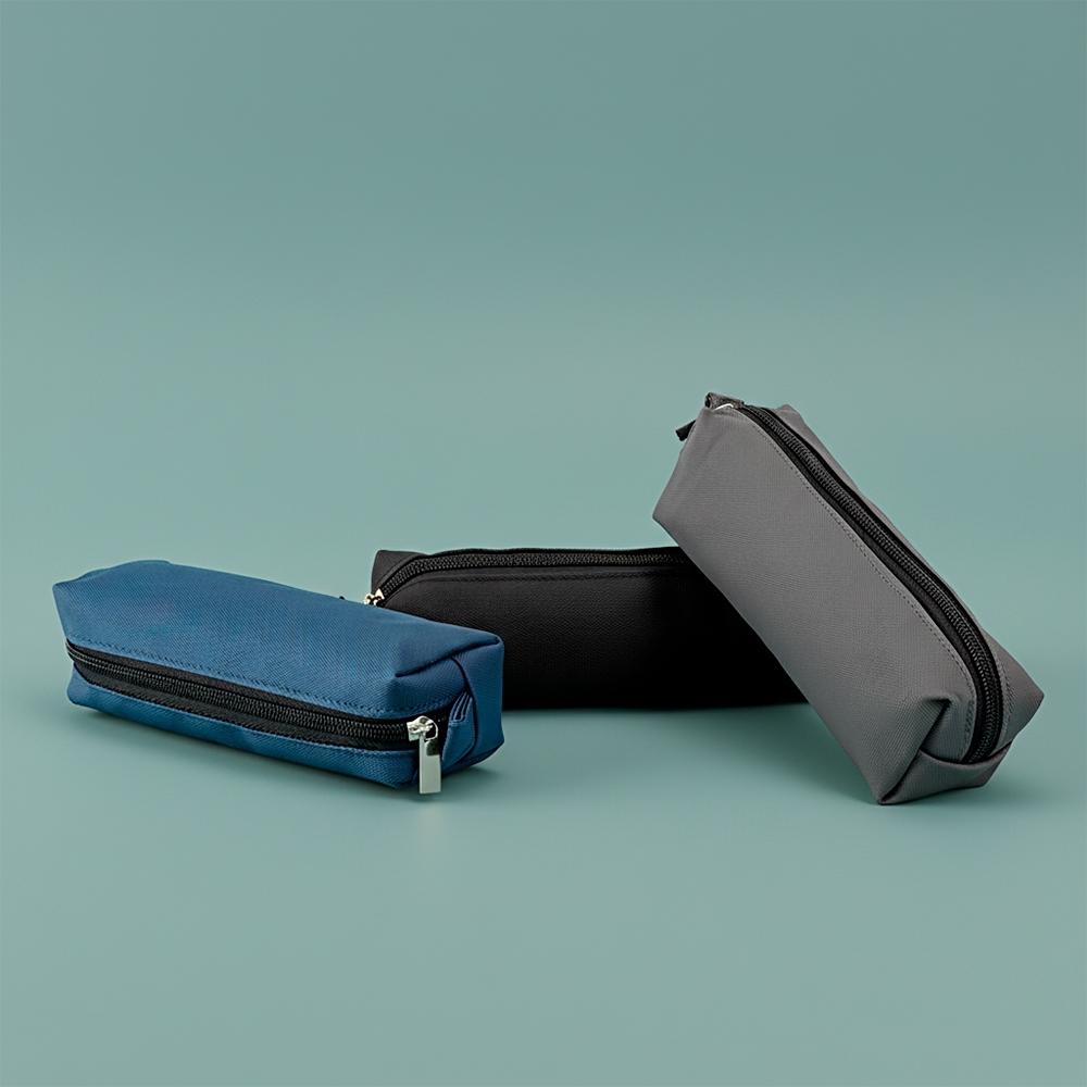 Estojo confeccionado em couro sintético com fechamento em zíper e uma pequena alça para fixação em chaveiro ou gancho.