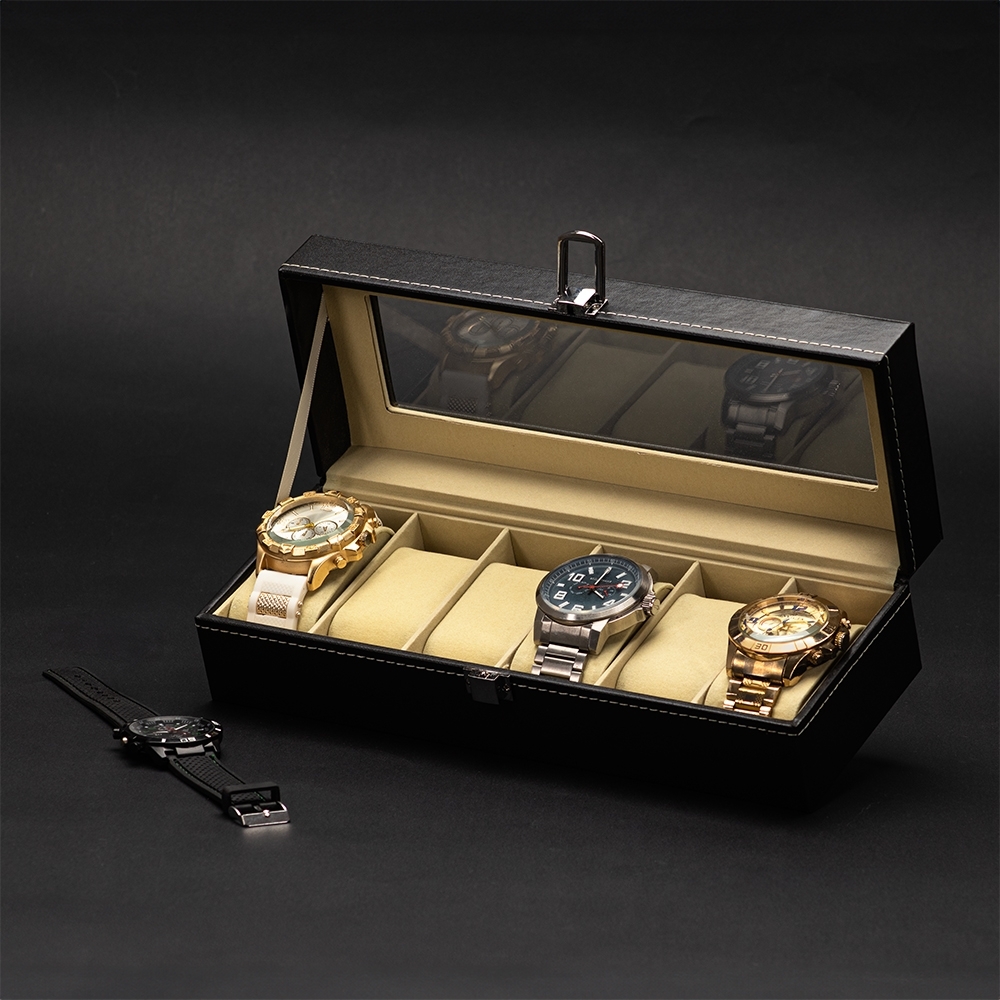 Porta-relógios com acabamento em couro sintético à base de PVC e revestimento interno em tecido aveludado. Dispõe de seis divisórias com almofadas removíveis, tampa com viseira de vidro e abertura em 90 graus, além de trava de segurança para o fechamento do estojo.