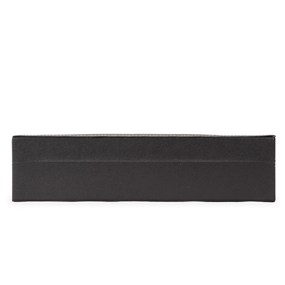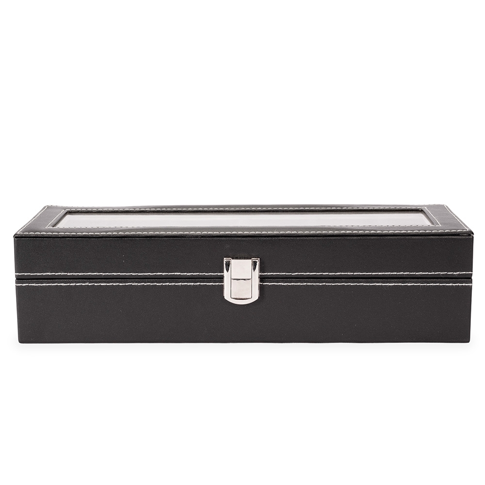 Porta-relógios com acabamento em couro sintético à base de PVC. Possui revestimento interno em veludo e seis divisórias com almofadas removíveis, além de visor de vidro na tampa e trava de segurança para o fechamento do estojo.
