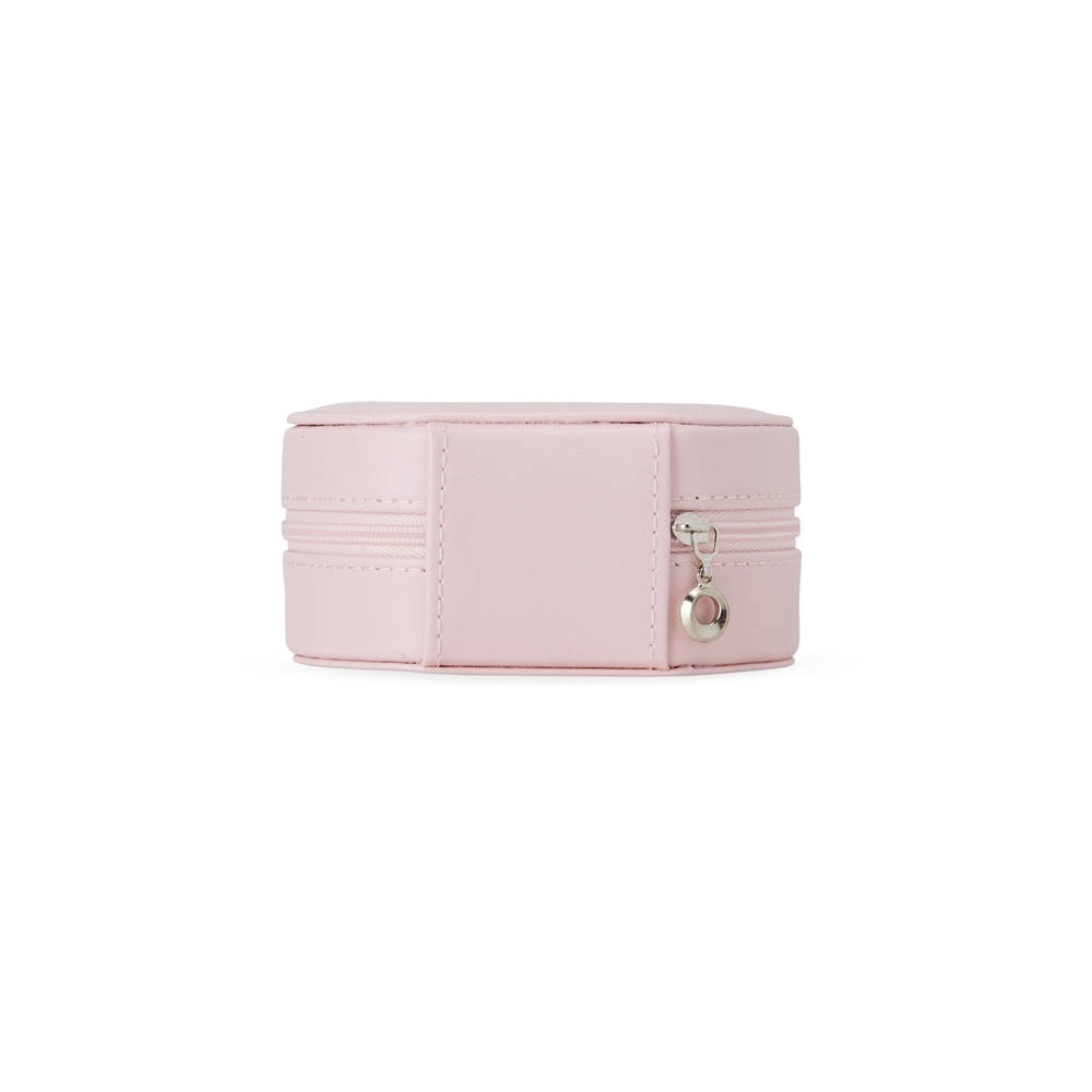 Porta-joias de couro sintético com revestimento aveludado. Possui compartimentos internos para anéis, brincos, pulseiras e colares.