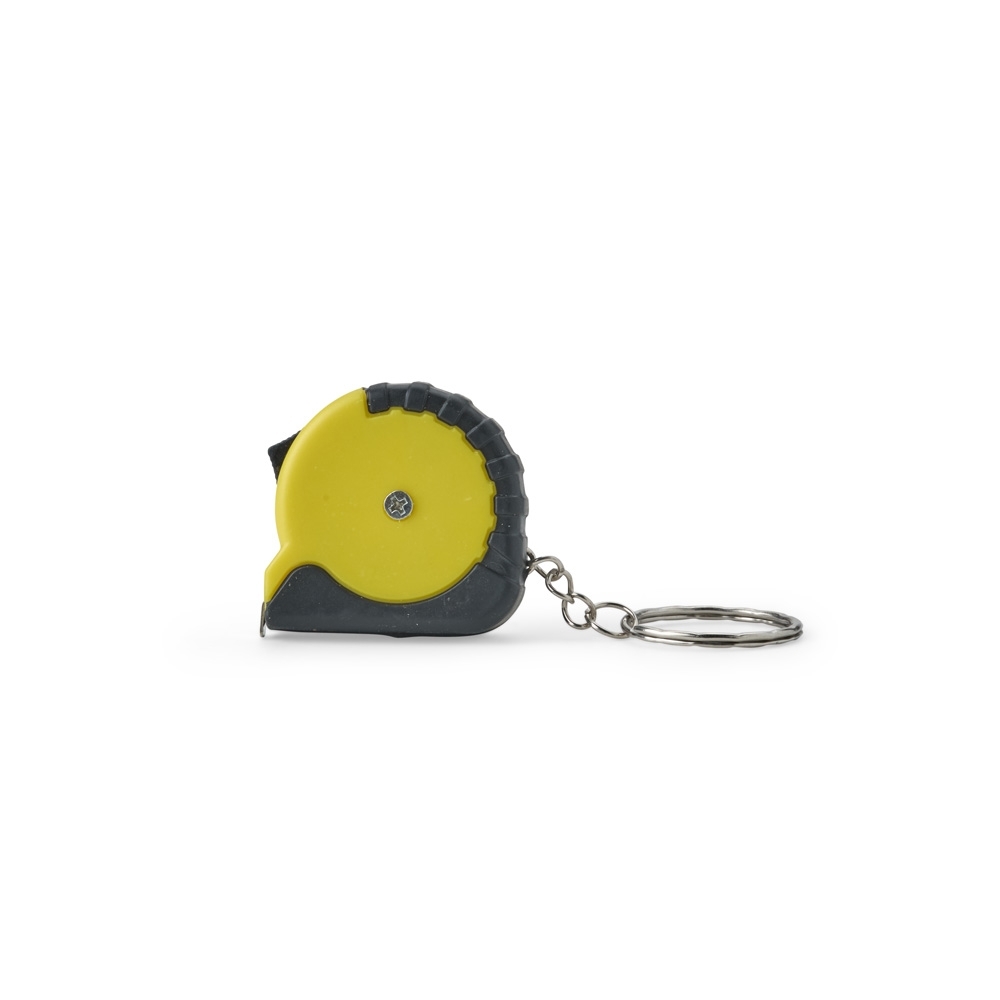 Chaveiro trena feito em plástico com argola metálica e fita de aço com alcance de até 1 metro, também com marcação de medidas em pés e polegadas.