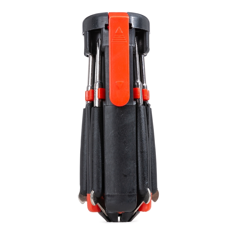 Kit ferramenta retrátil com 7 chaves e lanterna de 6 Leds. Material plástico, possui 3 chaves Philips; 3 chaves de fenda; chave de ponta dupla sendo um mini Philips e uma mini Fenda em cada extremidade, basta desrosquear as tampas para visualizá-las. Clip vermelho com setas explicativas para abertura do compartimento de pilhas, pressione a localização da seta superior e empurre ao mesmo tempo a parte inferior para remoção, necessita de 3 pilhas AAA(não acompanha).