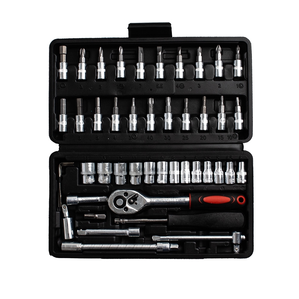 Solução para reparos, garantindo precisão ao apertar ou afrouxar parafusos. Nosso Kit com 45 peças é perfeito para diferentes tarefas de manutenção. Composto por 1 chave catraca reversível, 13 soquetes, 21 soquetes com bits, 1 ponta Torx, 3 chaves hexagonais, 1 cabo Fixo, 1 junta universal, 1 cabo de força em T, 1 adaptador de bits e 2 extensões flexíveis. As peças vêm organizadas em uma maleta de plástico resistente, garantindo que tudo fique sempre em ordem e fácil de transportar.