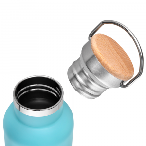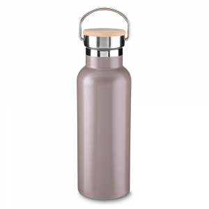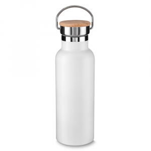 [vc_row][vc_column width=”2/3″]n[vc_column_text]Garrafa em aço inox parede dupla de 500ml, conserva a temperatura quente ou fria.nTampa com revestimento em fibra de bambu.nAlça em metal.nDetalhe cromado.nPintura fosca.n