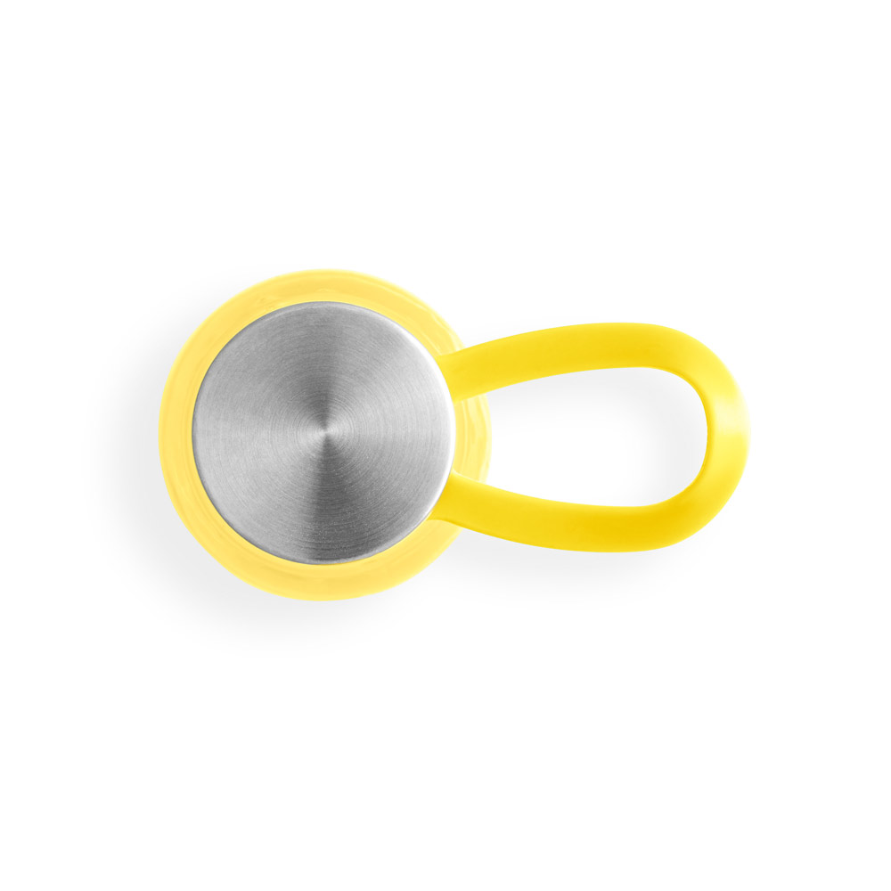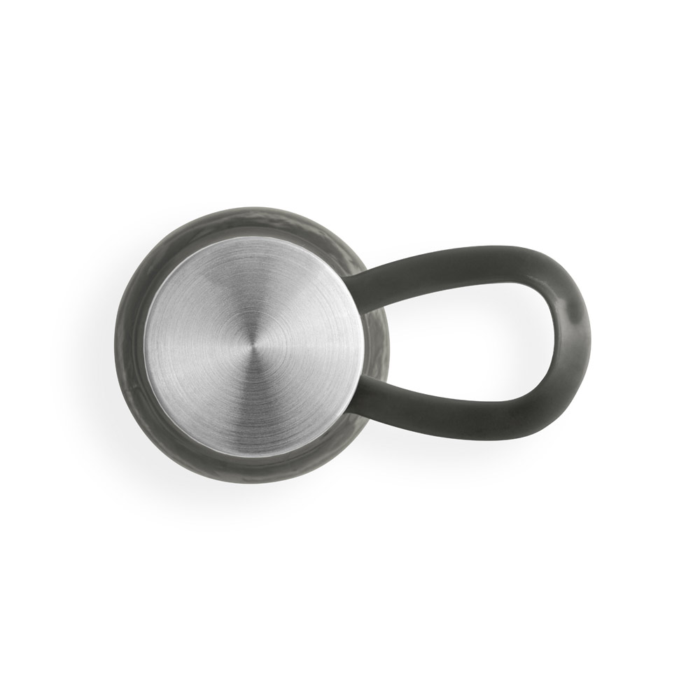 Squeeze em PET 100% reciclado com alça de silicone para facilitar o transporte. A tampa em PP e aço inox possui isolante em silicone. Capacidade até 590 mL. Caixa branca 94651 vendida opcionalmente. Certificação EU Food Grade. ø66 x 230 mm