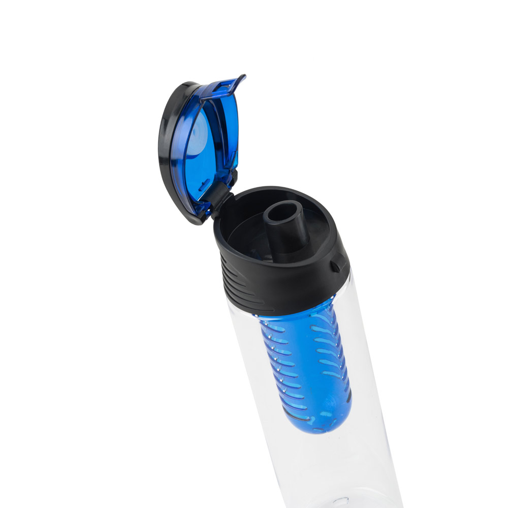 Squeeze em AS e com tampa flip top em PP, com infusor de frutas incluso. Capacidade até 740 mL. Caixa branca 94657 vendida opcionalmente. Certificação EU Food Grade. ø70 x 247 mm