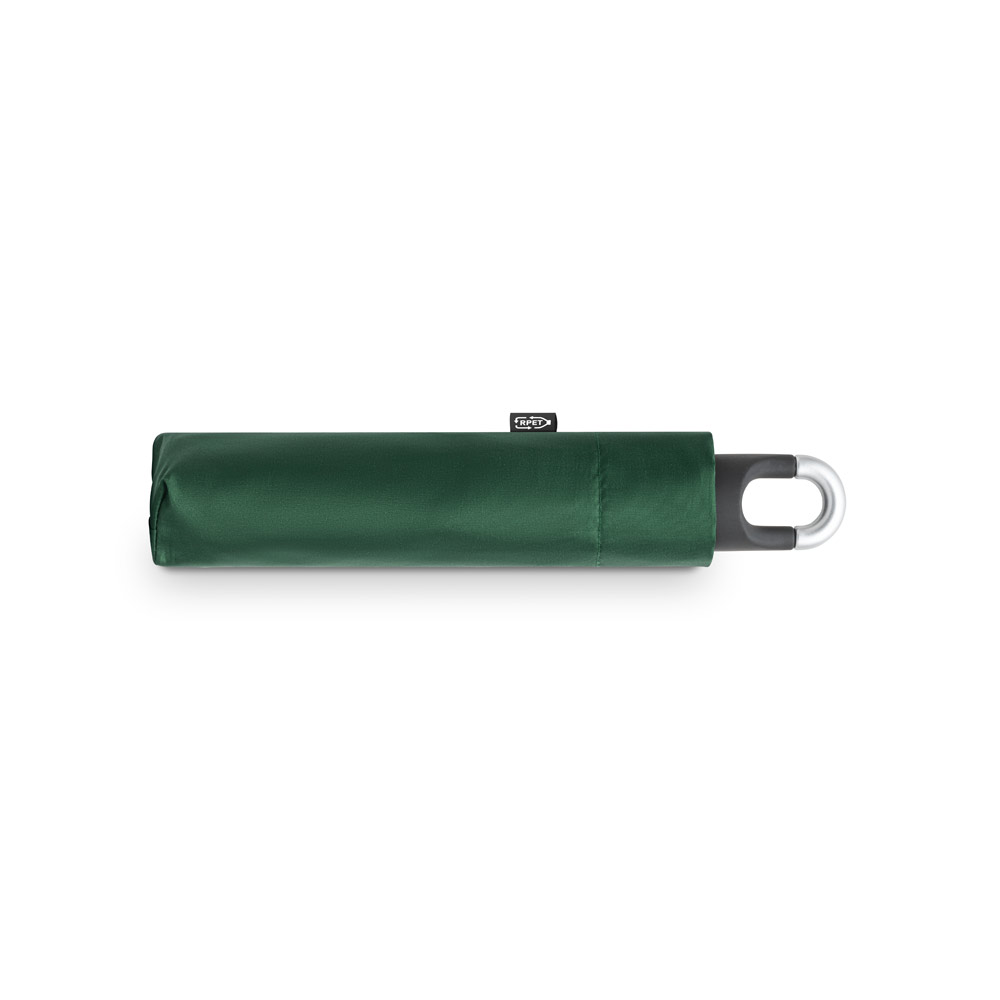 Guarda-chuva de 21” em poliéster 100% reciclado pongee 190T, com varetas em fibra de vidro, haste metálica e pega em ABS reciclado. O guarda-chuva, dobrável em 3 seções, tem abertura manual e é à prova de vento. Fornecido numa bolsa individual. ø980 x 280 mm | Bolsa: ø50 x 230 mm