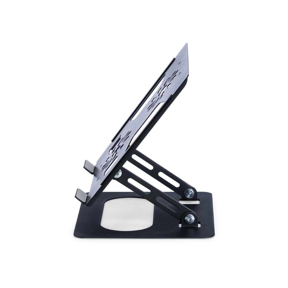 Suporte para notebook em aço com ajuste em múltiplos ângulos e capacidade para aparelhos de até 15,6 polegadas. Conta com aberturas que favorecem a dissipação de calor e tiras antiderrapantes para maior estabilidade.