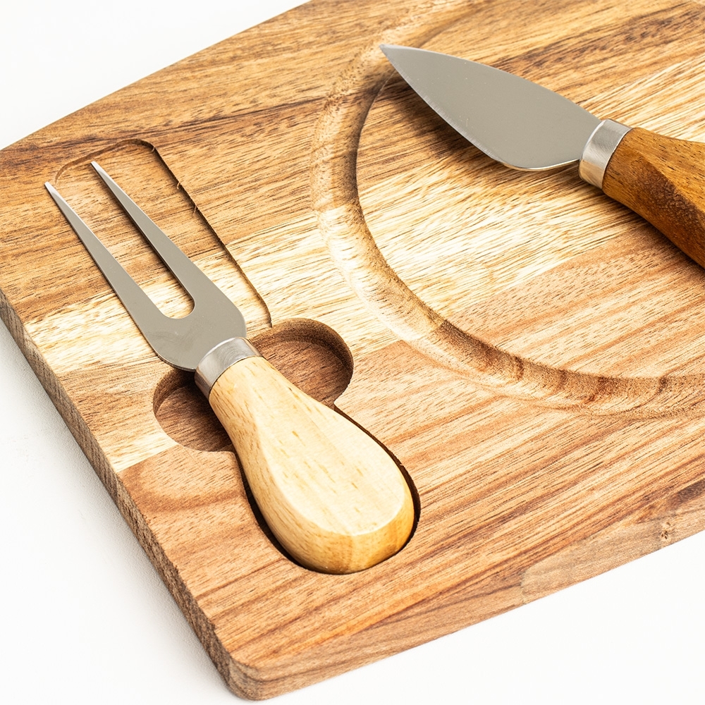 Kit queijo 3 peças, contém: tábua de madeira com canaleta, faca com ponta, e garfo. Tábua com imã para encaixe e fixação dos utensílios.