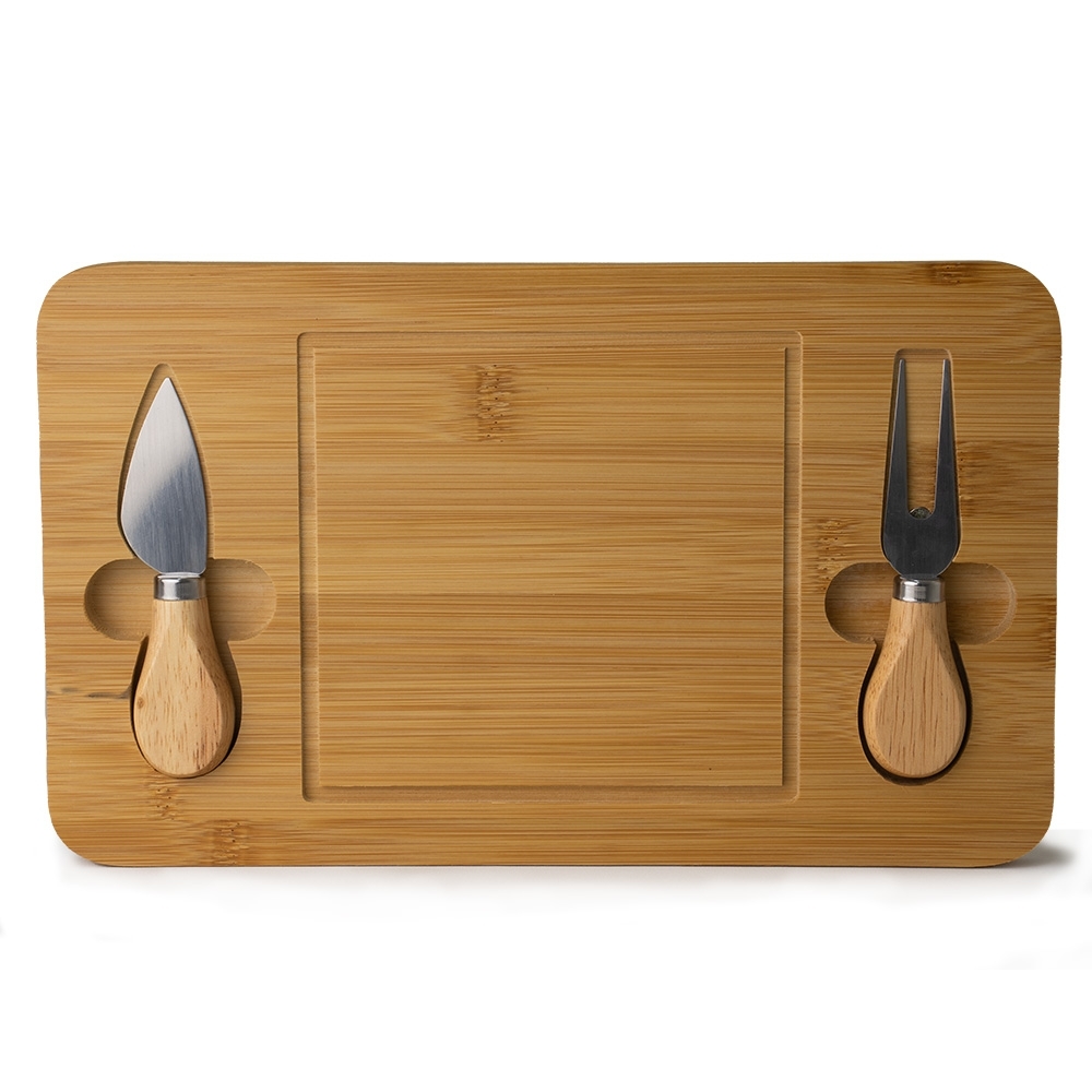 Kit queijo 3 peças, contém: tábua de bambu canaleta, faca com ponta e garfo. Tábua com imã para encaixe e fixação dos utensílios.