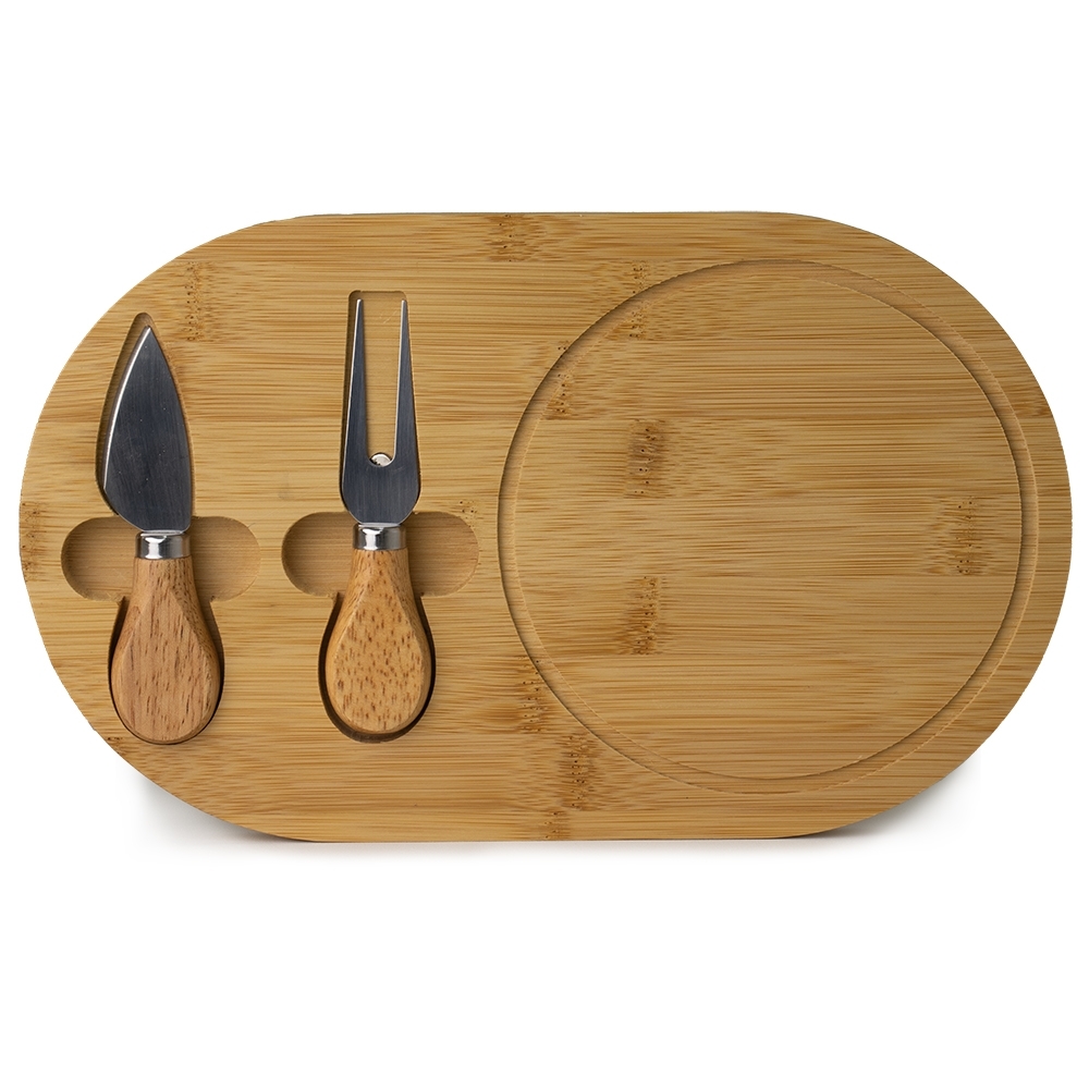 Kit queijo 3 peças, contém: tábua de bambu com canaleta, faca com ponta e garfo. Tábua com imã para encaixe e fixação dos utensílios. Altura :  29,9 cm Largura :  18 cmcm Espessura :  1,6 cm Medidas aproximadas para gravação (CxL):  12 cm x 12 cm Tamanho total aproximado  (CxL):  Garfo: 12,4 cm x 3 cm x 1,6 cm/ Faca: 11,9 cm x 3 cm x 1,6 cm Peso aproximado (g):  411
