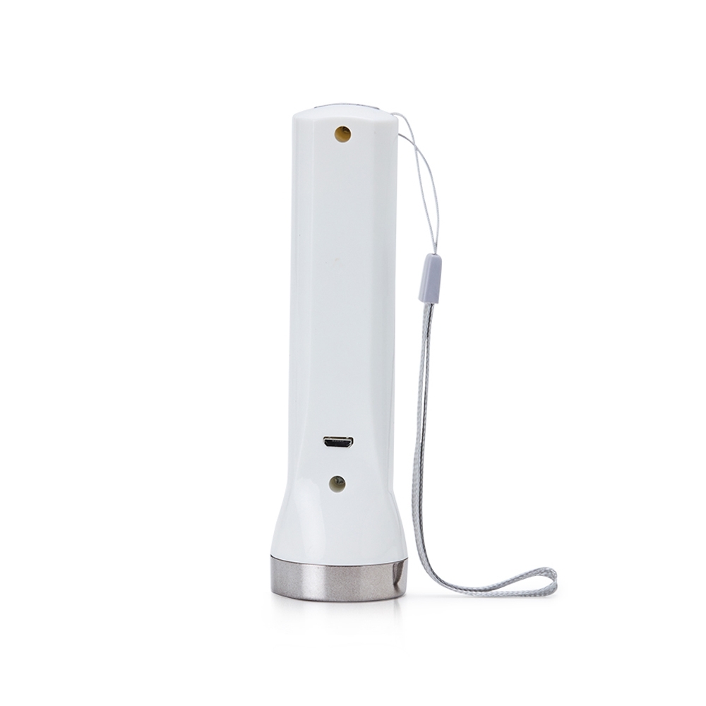 Lanterna plástica recarregável de um led com 3 estágios de iluminação e dois leds lateriais com função luminária. Possui cordão de nylon para transporte e acompanha cabo usb.