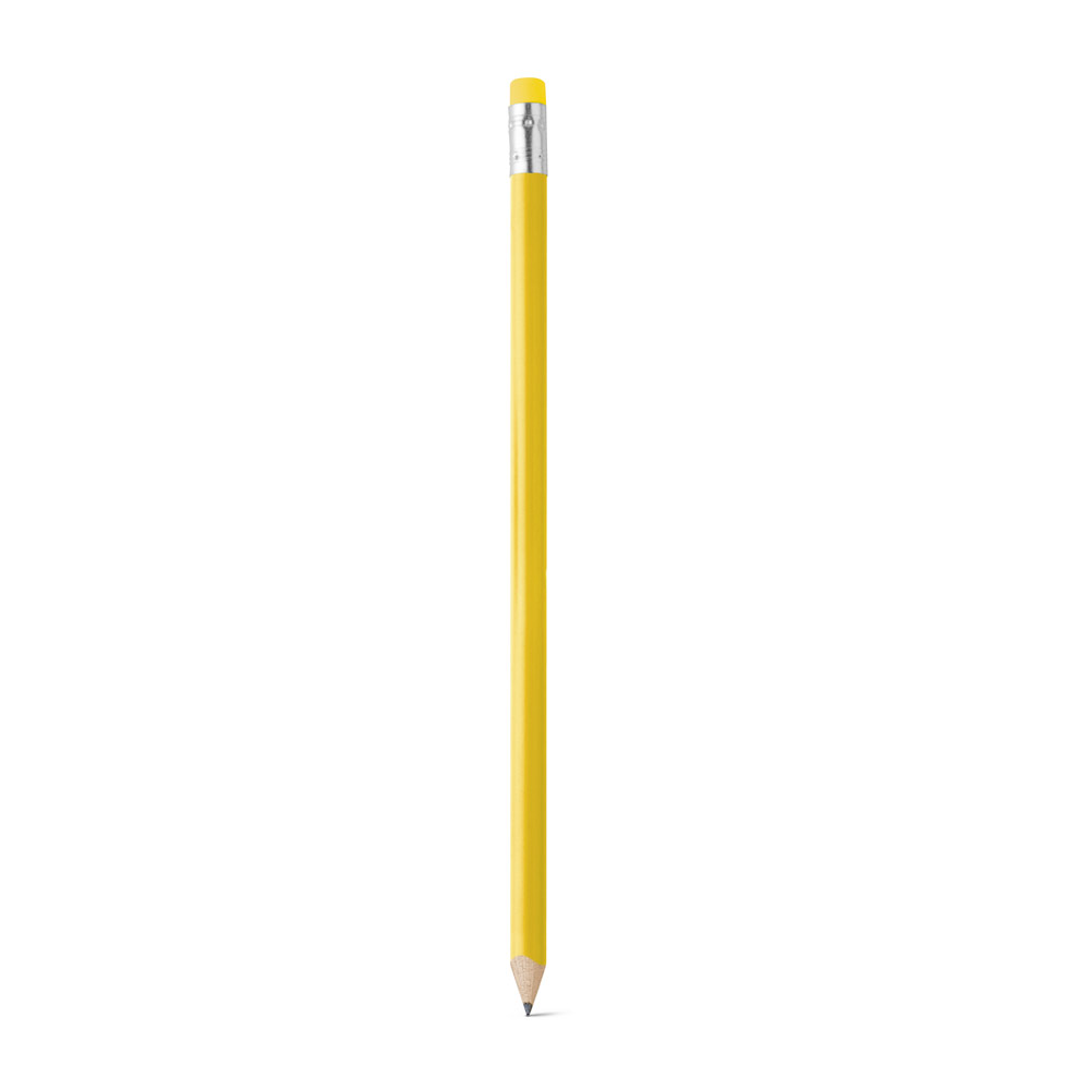 Lápis apontado com borracha. Grau de dureza: HB. Produto certificado de acordo com a portaria Inmetro nº423 de 8/out/2021 e entregue já apontado. ø7 x 190 mm