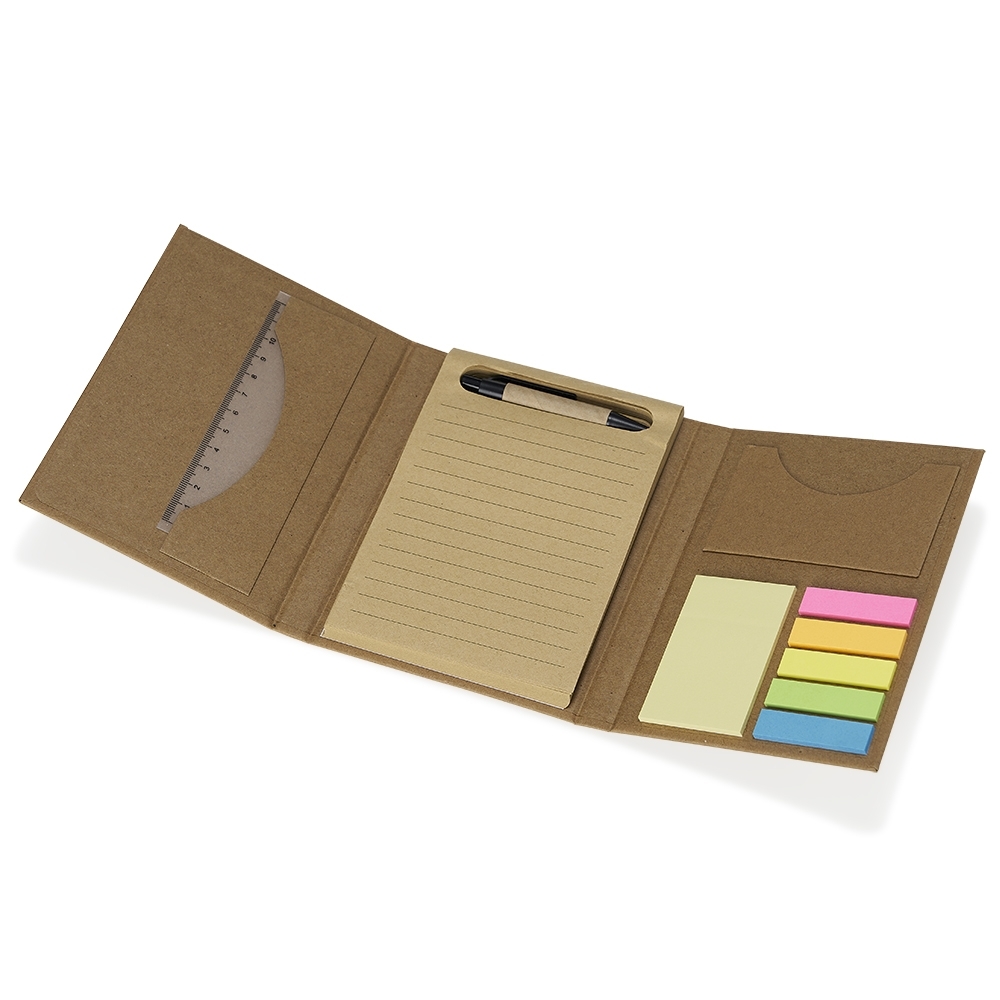 Bloco de anotações em papel kraft pautado em kraft, possui notas autoadesivas, compartimento para guardar anotações, uma régua em material plástico de 12 cm e caneta. Obs.: O bloco possui aproximadamente 70 folhas. Altura :  15,9 cm Largura :  11,4 cm Espessura :  1,7 cm Medidas aproximadas para gravação (CxL):  13 cm X 8 cm Peso aproximado (g):  163