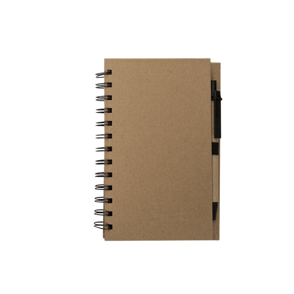 Caderneta ecológica com caneta e autoadesivos. Com dois suporte internos para cartão, possui cinco blocos autoadesivos com 20 folhas cada, bloco laranja e bloco amarelo com aproximadamente 20 folhas cada. Possui aproximadamente 70 folhas brancas pautadas e caneta de papelão de clip e ponteira plástica.