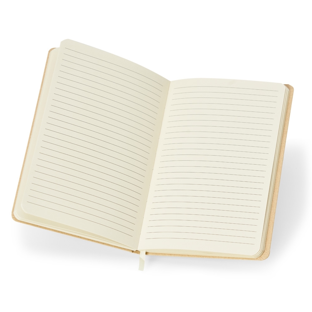 Caderneta de kraft com marca página em cetim e elástico para lacre. Contém aproximadamente 80 folhas marfim pautadas.