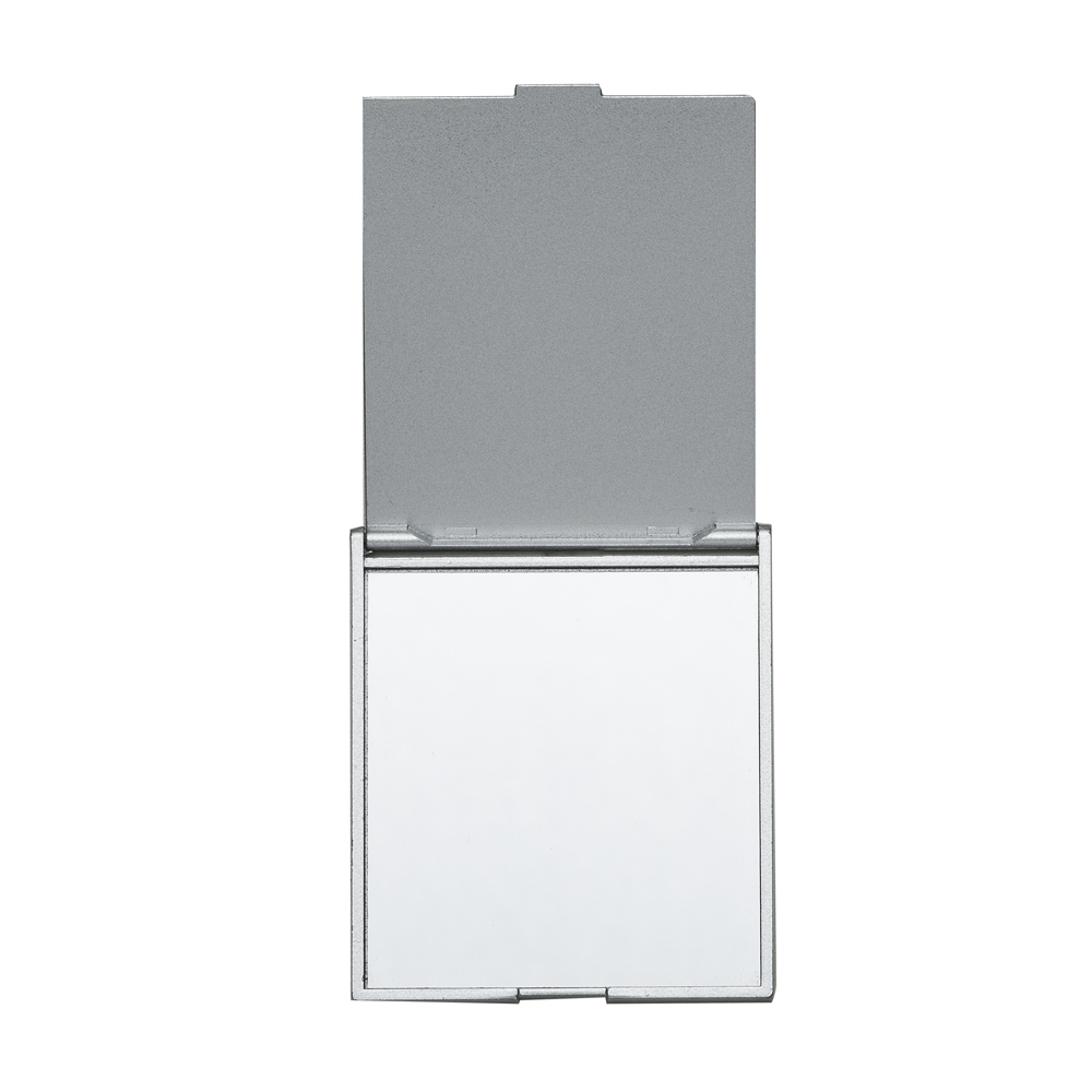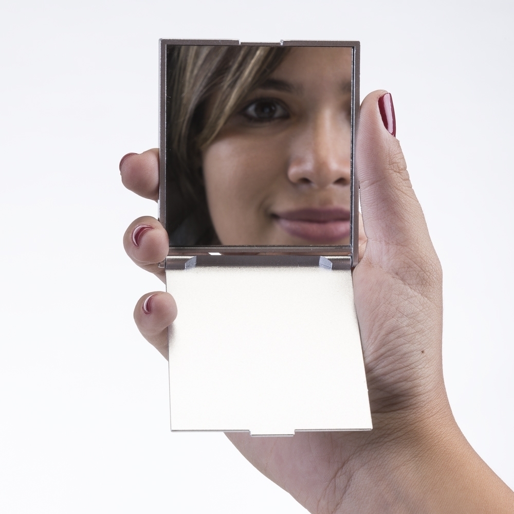Espelho de formato retangular sem aumento com estrutura feita em plástico liso resistente.