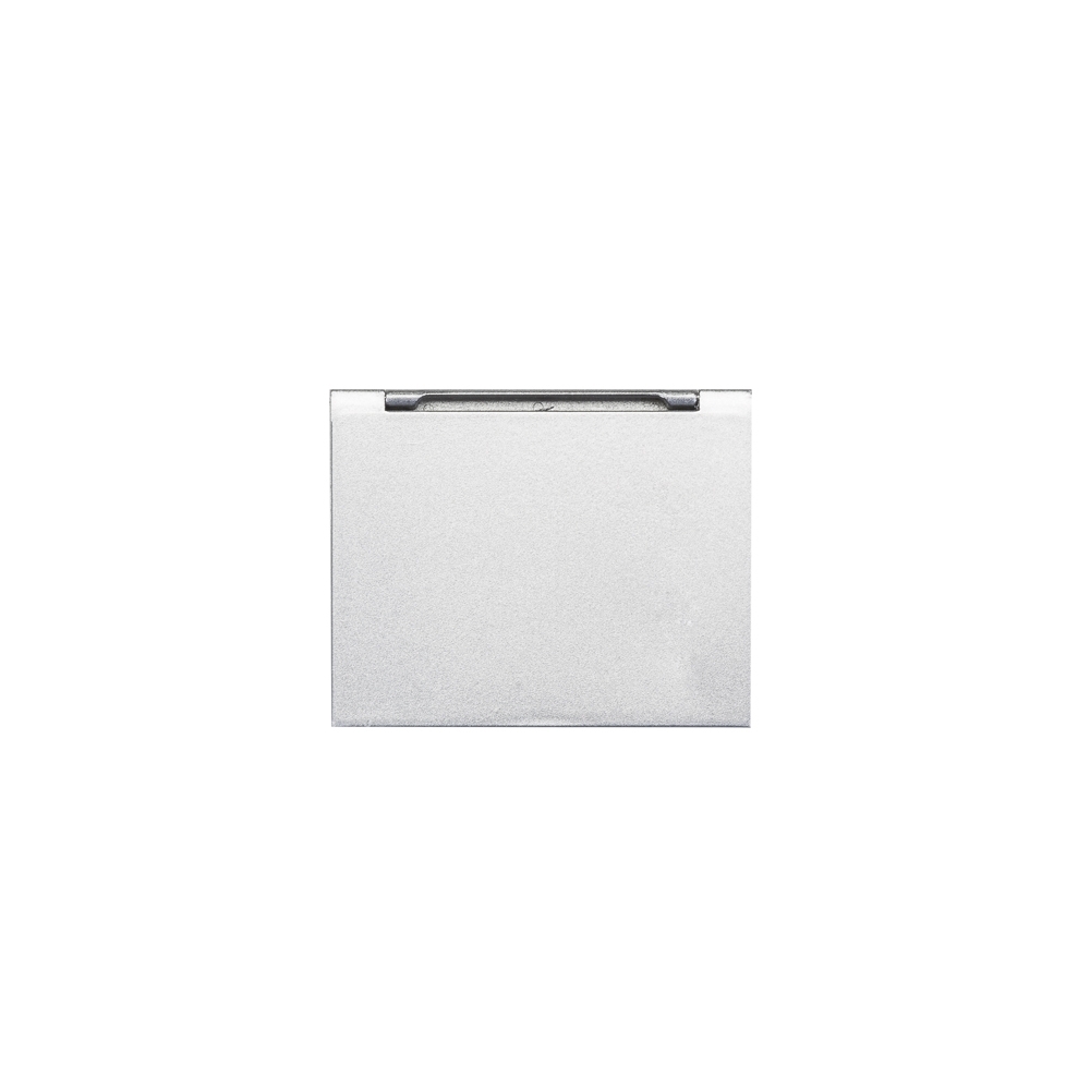 Espelho duplo compacto com moldura em plástico, detalhe ondulado na área da abertura e tampa de formato curvo. Possui dois espelhos: o superior sem aumento e o inferior com aumento.