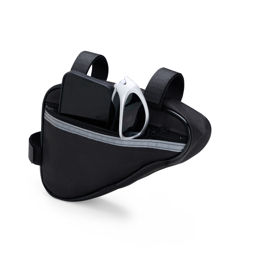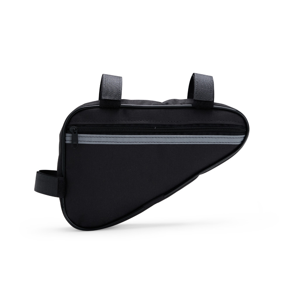 Bolsa de quadro de bicicleta confeccionada em Oxford impermeável. Possui um único compartimento, além de duas alças de nylon com fechamento em velcro e uma tira reflexiva costurada próxima à abertura da bolsa.