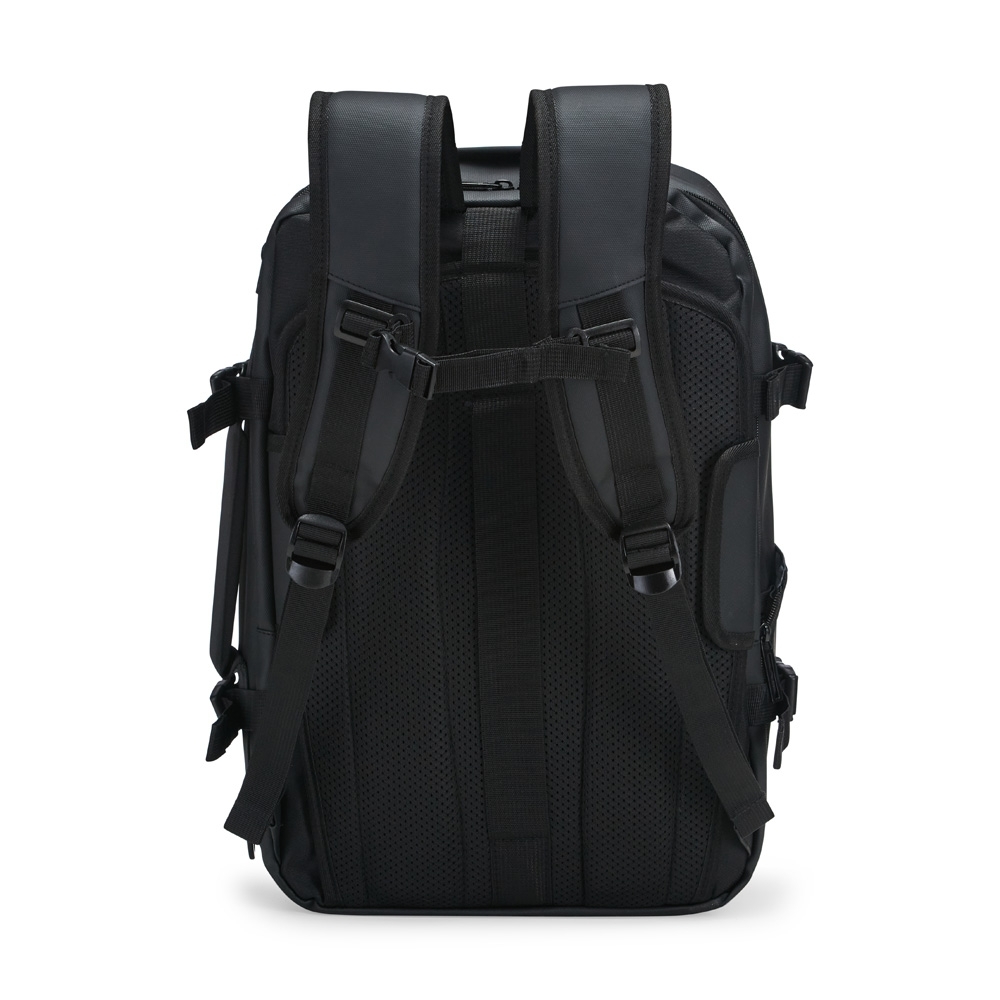 Mochila em nylon com uma camada de PU impermeável com capacidade máxima de 28 litros. Possui um compartimento interno a com sistema de vedação vácuo para guardar roupas e outros objetos (bomba compressora não incluído) e duas divisórias em poliuretano termoplástico de tamanhos diferentes, além de bolsos frontais, um lateral em tela e outro traseiro com divisória para notebook de até 15,6 polegadas. Dispõe ainda de alças acolchoadas em espuma respirável, uma alça lateral para transporte horizontal e outra para ombro ajustável em nylon.