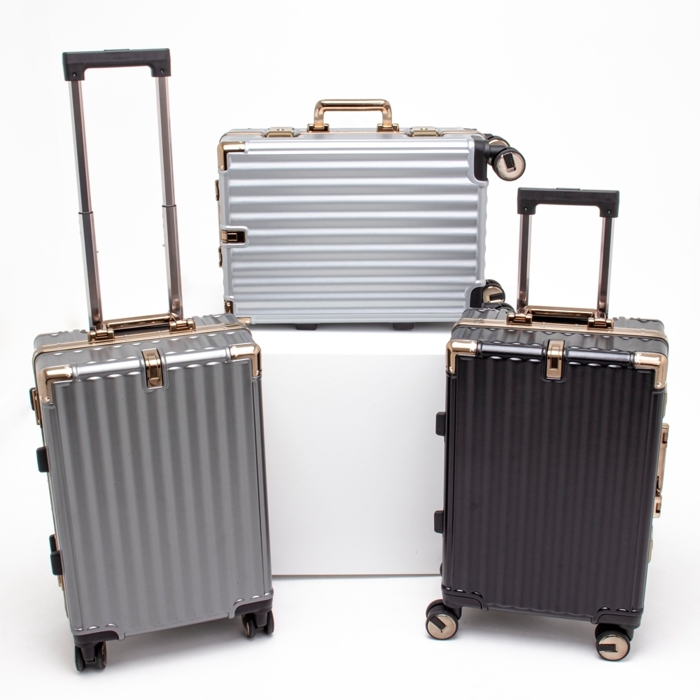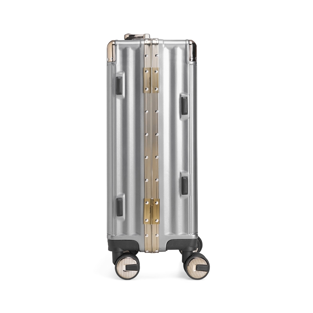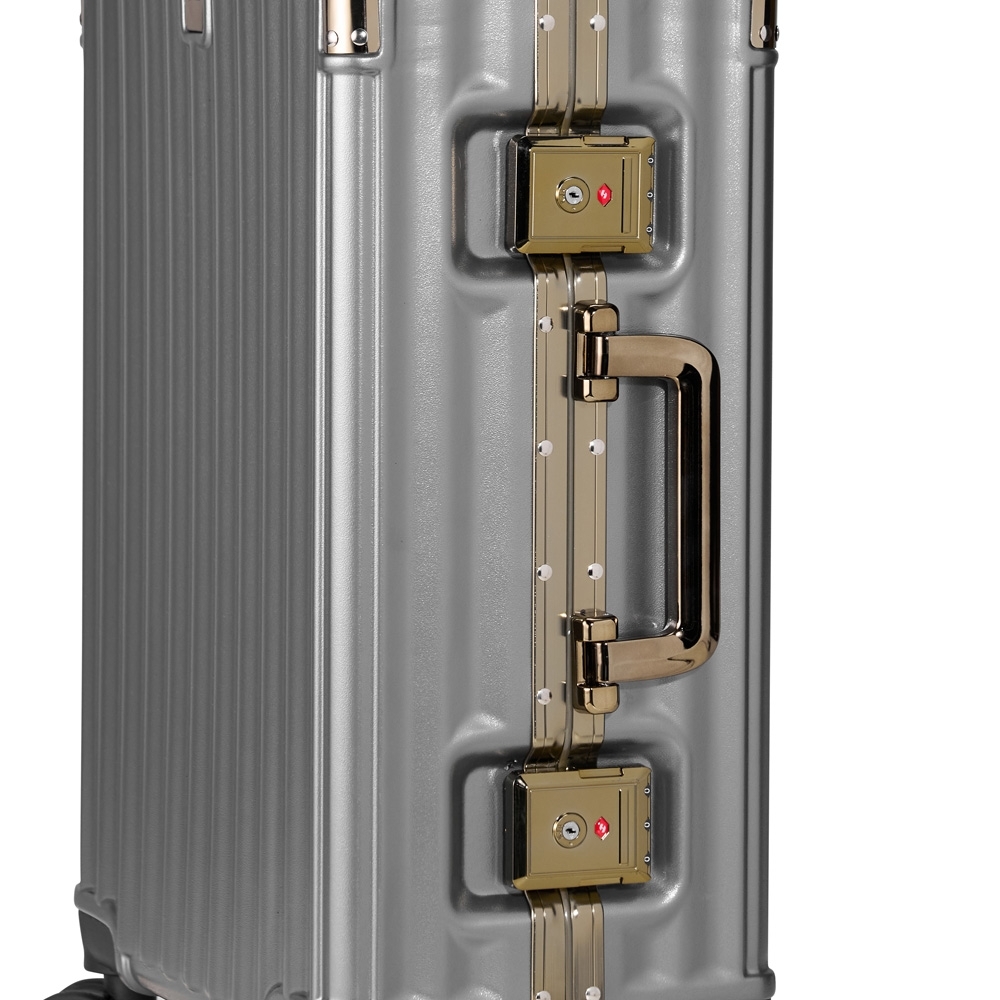 Mala de viagem 39 litros feita em plástico com acabamento em alumínio, contém cadeado numérico TSA. Compartimentos internos com bolso telado, bolso plástico para itens molhados e cinta compressora para roupas. A mala possui duas alças de mãos, puxador retrátil com regulagem de tamanho, suporte porta bolsa, quatro rodinhas 360º e apoios laterais.