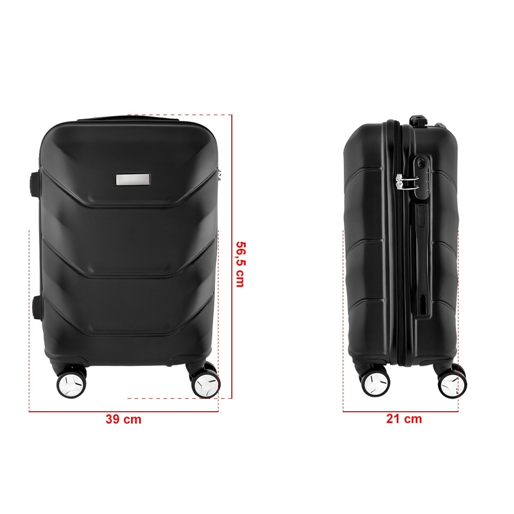 Mala de bordo 37 litros produzida em ABS com trava de segurança. Possui quatro rodinhas e apoiadores com borracha antideslizante para posicionar a mala na horizontal, alça de carrinho com botão para ajuste de tamanho; placa central para personalização; forro de poliéster e compartimentos internos de zíper além de um cinto protetor.