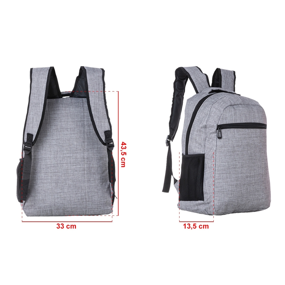 Mochila confeccionada em poliéster com compartimento para notebook até 15,6 polegadas. Contém um compartimento grande, compartimento frontal e bolsos laterais em malha. Alça de mão com revestimento espumado e alças para as costas ajustáveis. Altura :  43,5 cm Largura :  33 cm Profundidade :  13,5 cm Medidas aproximadas para gravação (CxL):  25 cm x 23 cm Peso aproximado (g):  389