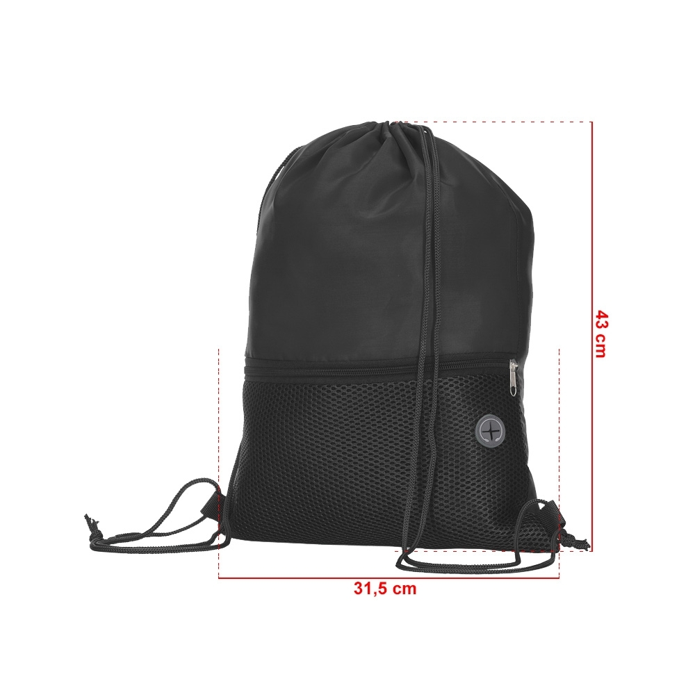 Mochila saco confeccionada em poliéster. Possui compartimento principal superior, bolso frontal de malha com zíper e saída para fone de ouvido.