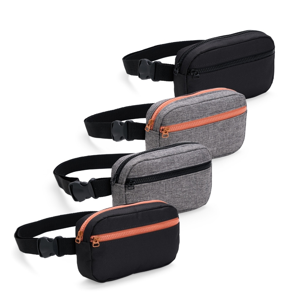 Pochete compacta feita em Oxford resistente à água. Possui compartimento principal e bolso externo, ambos com zíper, além de alça ajustável em nylon com engate rápido em plástico.