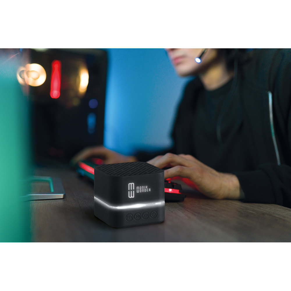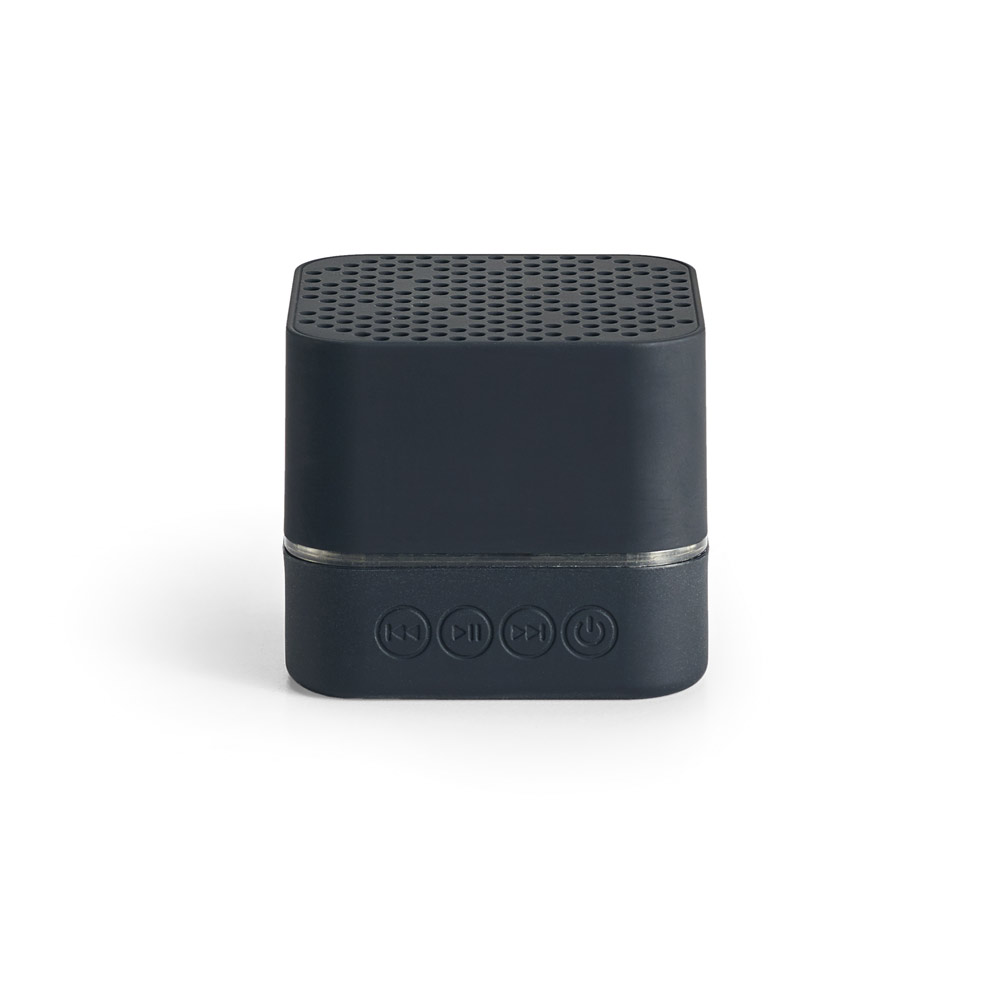 Caixa de som portátil, com luz LED no interior, em ABS e acabamento emborrachado. (personalizável com logótipo iluminado). Transmissão sem fios BT v4’2 e potência de 3W (4Ω). Bateria com 300 mAh e autonomia aproximada de 2h. Incluso cabo 2 em 1: USB / micro USB para carregamento e micro USB/3’5 jack. Fornecida em caixa presente. 59 x 59 x 51 mm