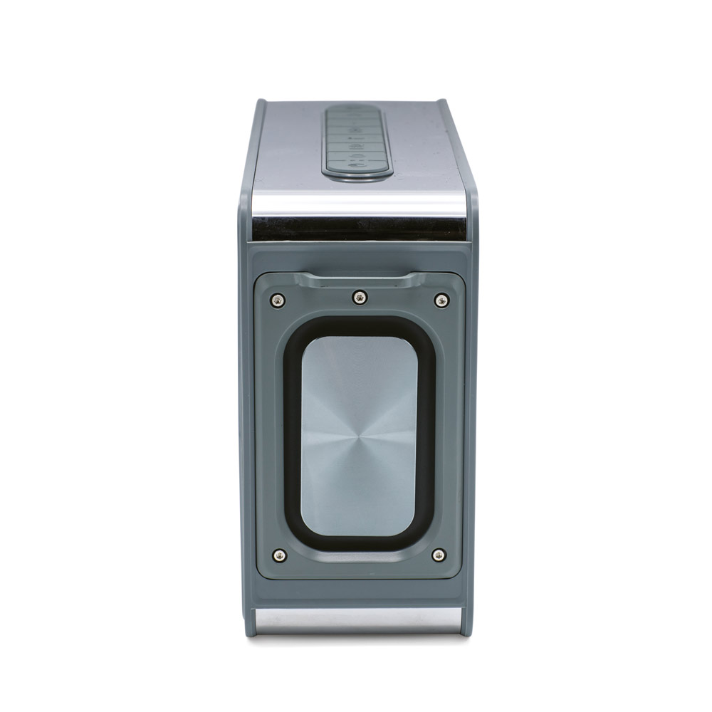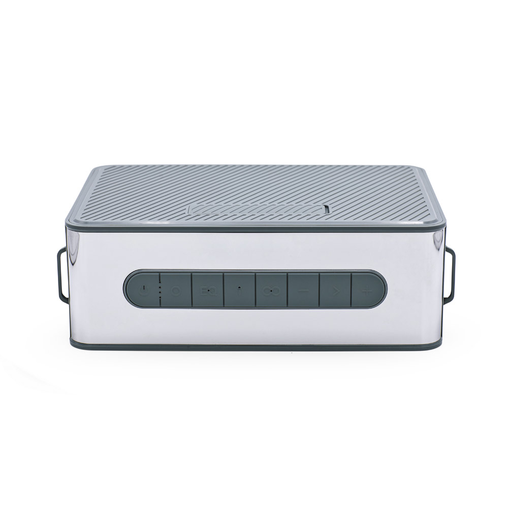 Caixa de som em ABS 100% reciclado com 80W de potência. A capacidade da bateria é de 5’200 mAh, o que permite uma autonomia aproximada de 7h. Tem equalizador com 3 modos, transmissão BT 5’3, entrada e saída AUX e permite ligar microfone externo ou guitarra diretamente. Possibilidade de emparelhar duas caixas de som Jouncer para efeito stereo. Incluso carregador e uma alça para transporte da caixa de som ao ombro. Fornecido em caixa presente de papel kraft reciclado. A grelha é fornecida solta para pedidos não personalizados. 293 x 198 x 105 mm | Caixa: 330 x 309 x 147 mm