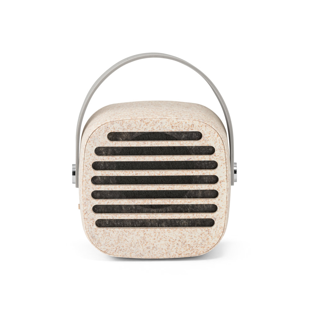 Caixa de som portátil em fibra de palha de trigo e ABS, com alça em silicone para facilitar o transporte. Possui transmissão sem fios BT v5’0, potência de 3W, bateria com 500 mAh e autonomia, aproximada, de 4h30. Incluso cabo USB. Fornecido em caixa presente de papel kraft reciclado. A cor e o resultado da impressão nos materiais naturais pode variar entre produtos. 70 x 70 x 34 mm