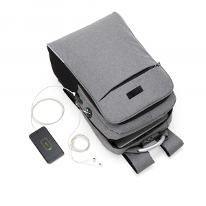 Mochila p/ Notebook em tecido poliéster com placa imantada 5x2cmParte externa:Fechamento por cadeado com senha;Alça de mão em metal;Alça de ombro acolchoada;2 bolsos frontais; 2 bolsos laterais; Mini bolso na alça de ombro;Conector USB na lateral;Saída para fones de ouvido na lateral.Parte interna:Compartimento para notebook de 30x27cm,Tamanho total do Notebook - 16,5¨