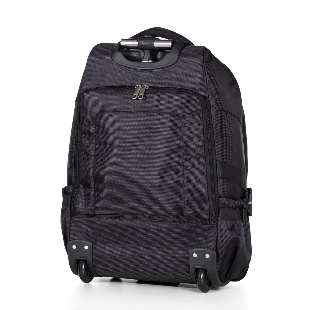 [vc_row][vc_column width=”2/3″]n[vc_column_text]Mochila de nylon com rodinhas. Possui alça de mão, puxador retrátil com regulagem e botão acionador, alças para as costas escondidas no compartimento traseiro com zíper, compartimento mediano com duas divisórias teladas, compartimento mediano também com abertura frontal, possui detalhes laranja e bolsos laterais. O compartimento principal possui bolso para notebook até 15.6 polegadas, forro com zíper. A parte interna conta com um sistema organizatório através de alças de nylon ajustáveis, quando utilizadas impedem que as roupas se movimentem dentro da mochila enquanto à transporta. Possui duas rodinhas e freios em plástico, além de um sistema velcro para junção do compartimento das alças com a parte inferior, tampando as rodinhas enquanto transporta a mochila nas costas. Acompanha plaquinha metálica para personalização. Altura : 59 cmn Largura : 45 cmn Profundidade : 24 cmn n n n Medidas aproximadas para gravação (CxL): 1,2 cm x 4,8 cmn n Peso aproximado (g): 2158n
