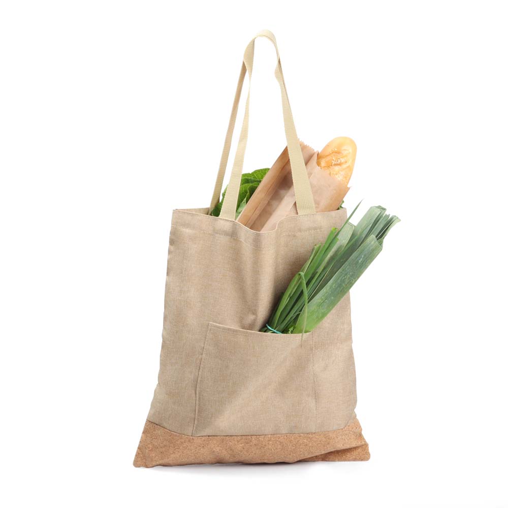 Bolsa em Poliéster 600D com detalhe em cortiça e alça reforçada. Alça com altura de23 cm, ideal para transporte.