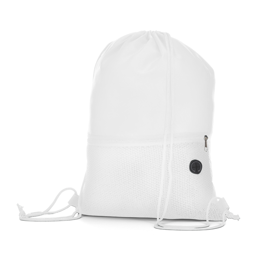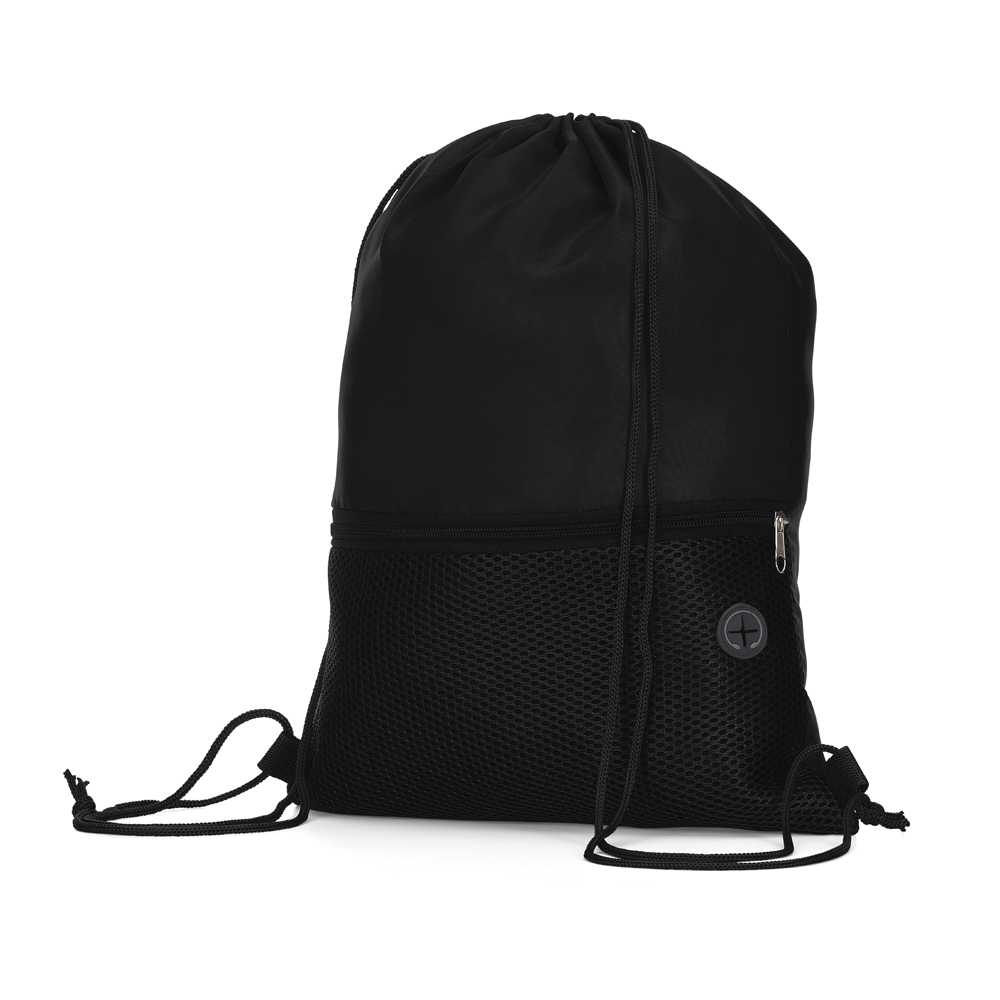 Sacola/Mochila em tecido poliéster 210D com bolso frontal com zíper.